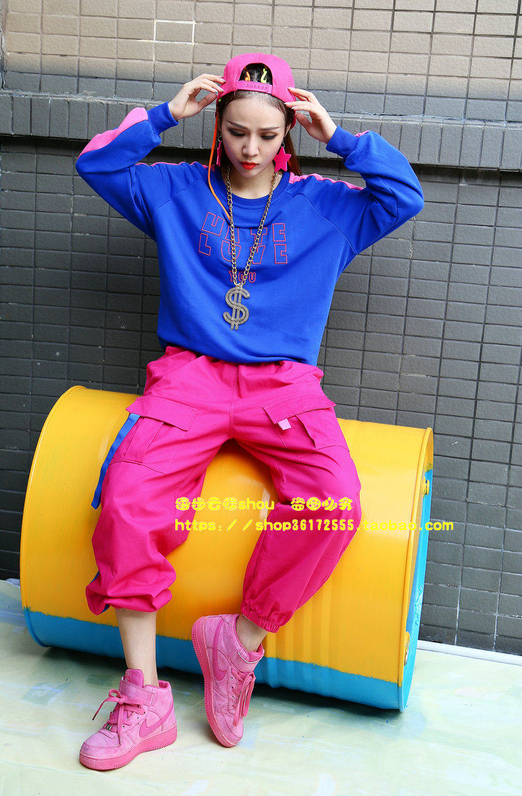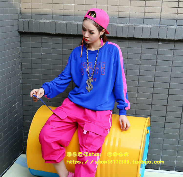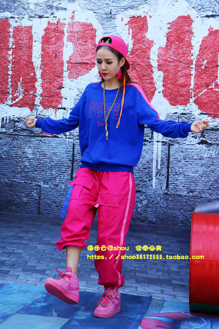 Blue Square Dance Costume Sports Suit Women Loose Hiphop Street Dance Pants Ghost dancing team to perform
