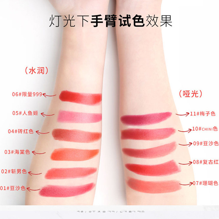1# Bean Paste Color (Water Moisturizing) 2# Cut Male Color (Water Moisturizing) 3# Begonia Color (Water Moisturizing) 4# Brick Red (Water Moisturizing) 5# Mermaid Ji (Water Moisturizing) 6# Limited 999 (Water Moisturizing) 7# coral