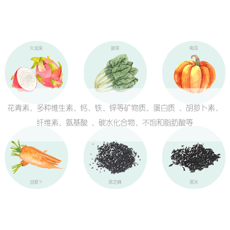 Pure water for wheat flour and powder of spinach powder pumpkin powder carrot powder black sesame powder