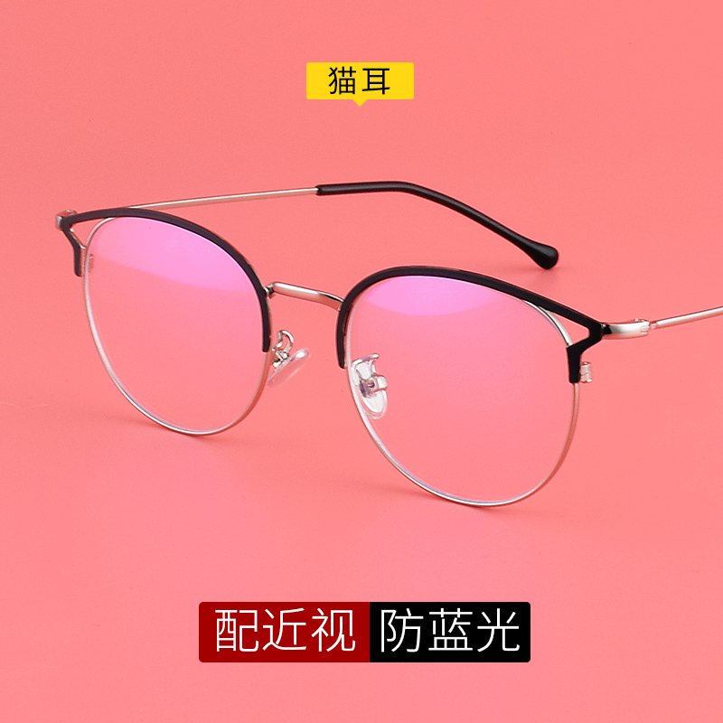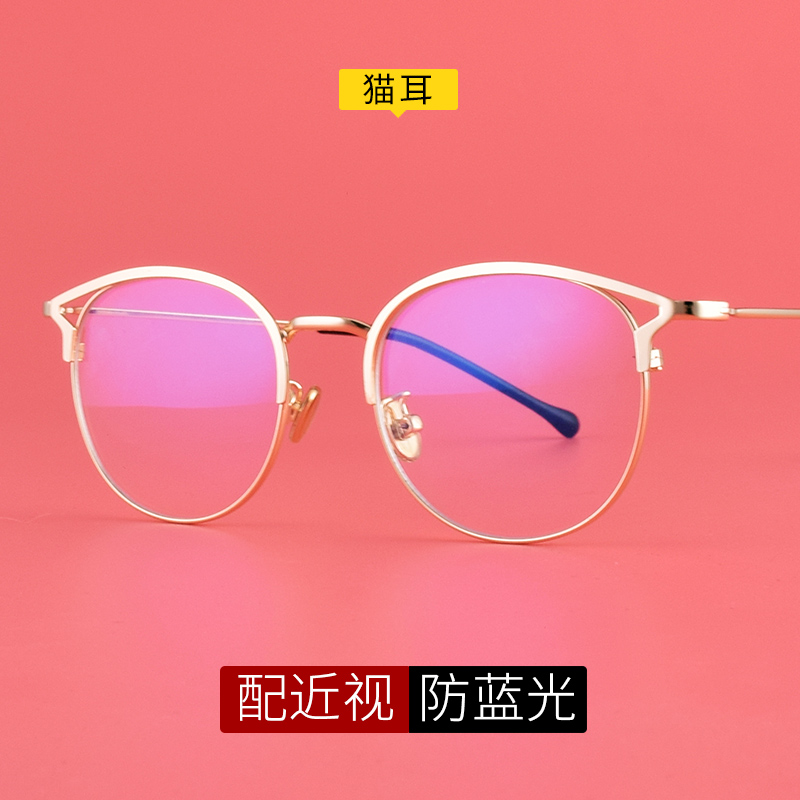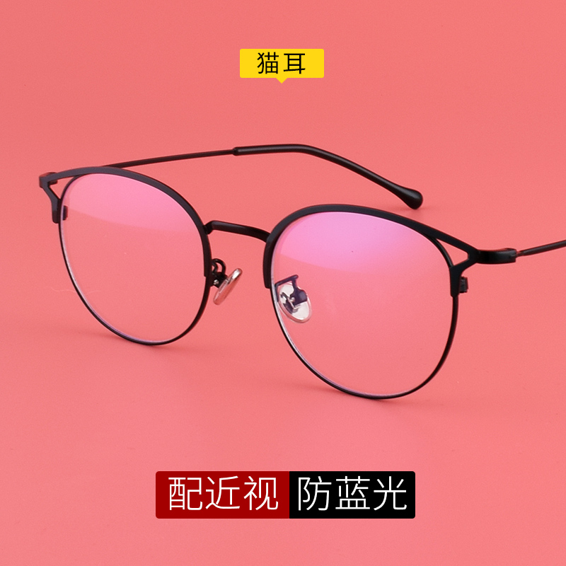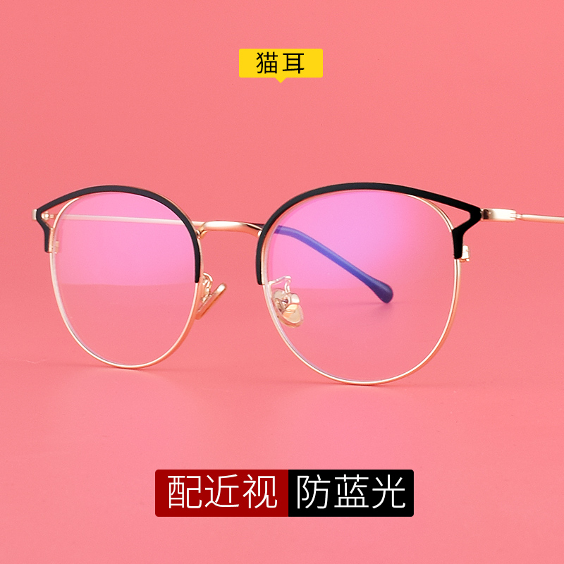Retro cat ear glasses frame female myopia large frame cat ears small glasses frame personality round face cute anti-blue light finished product