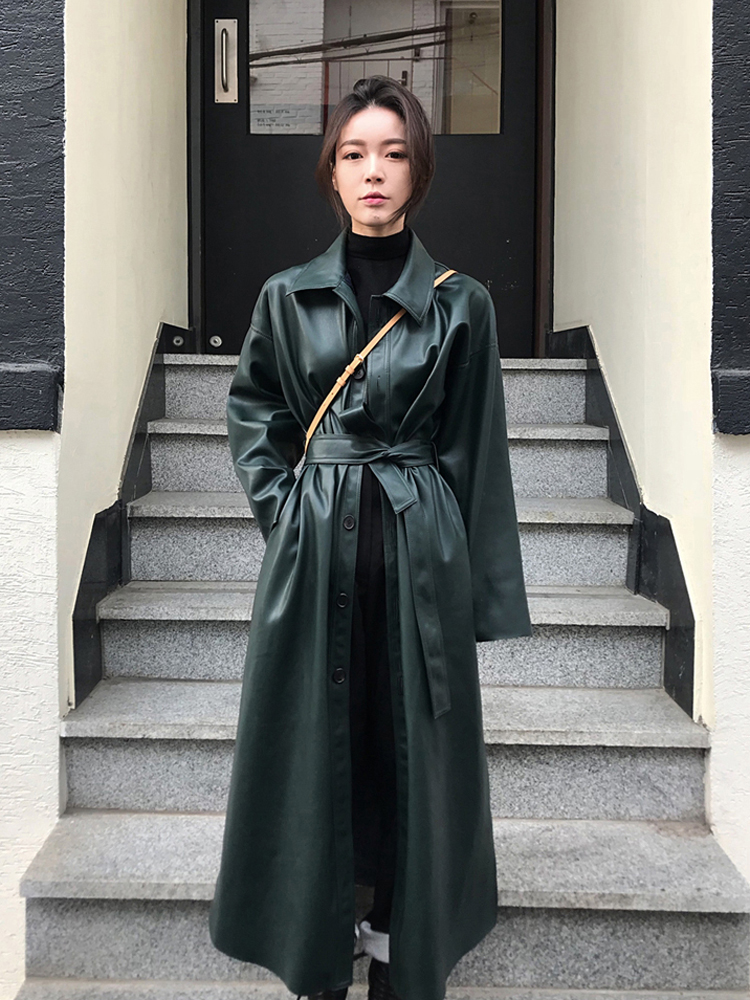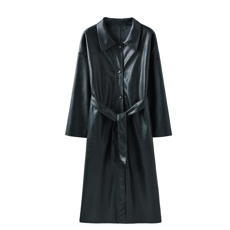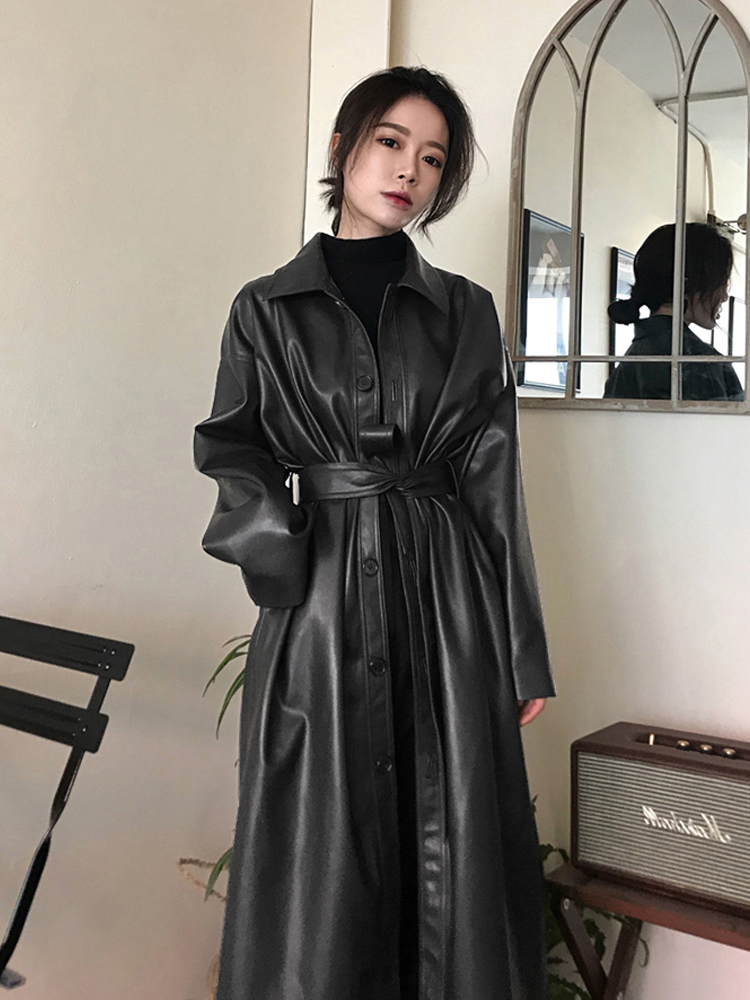 Handsome super cool personality long leather women loose slim lace-up Puppin windbreaker coat coat 2021 autumn winter wear new