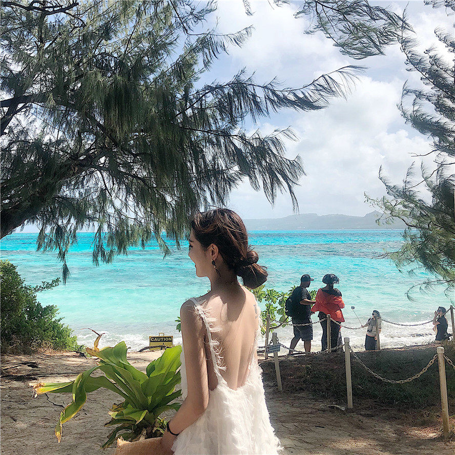 Net red dress Children white hanging band Skirt Thai Beach Skirt Seaside Resort Long Skirt Back Lumpy Suocean Dress