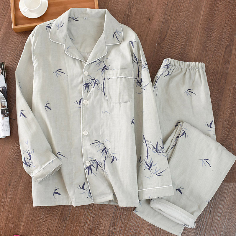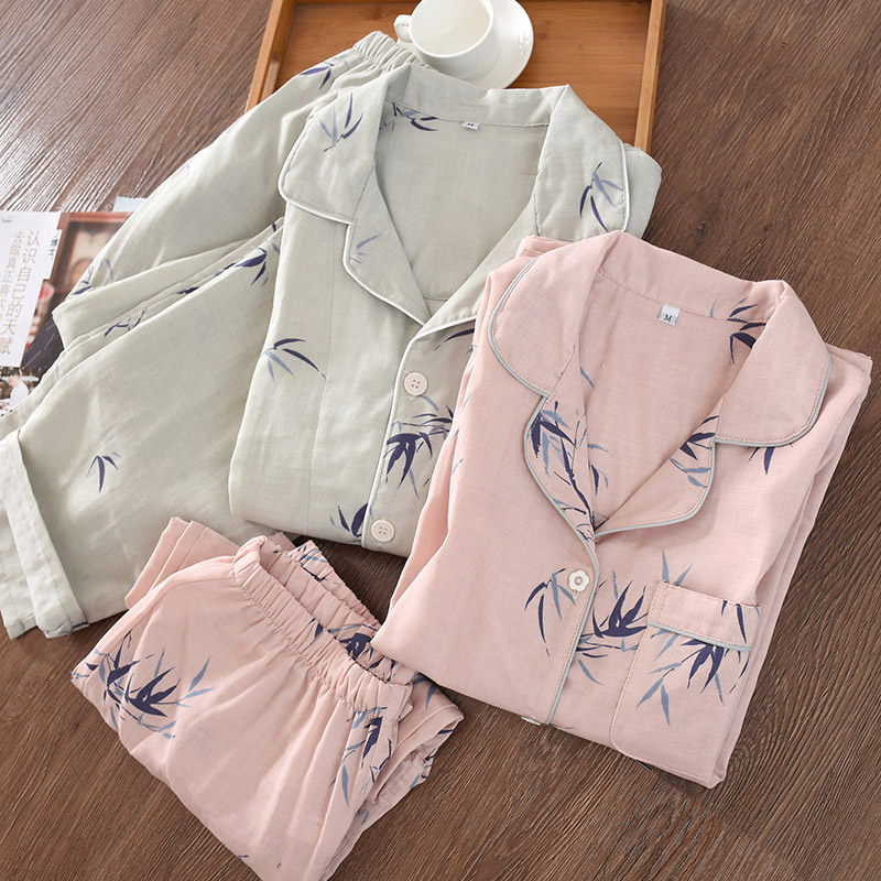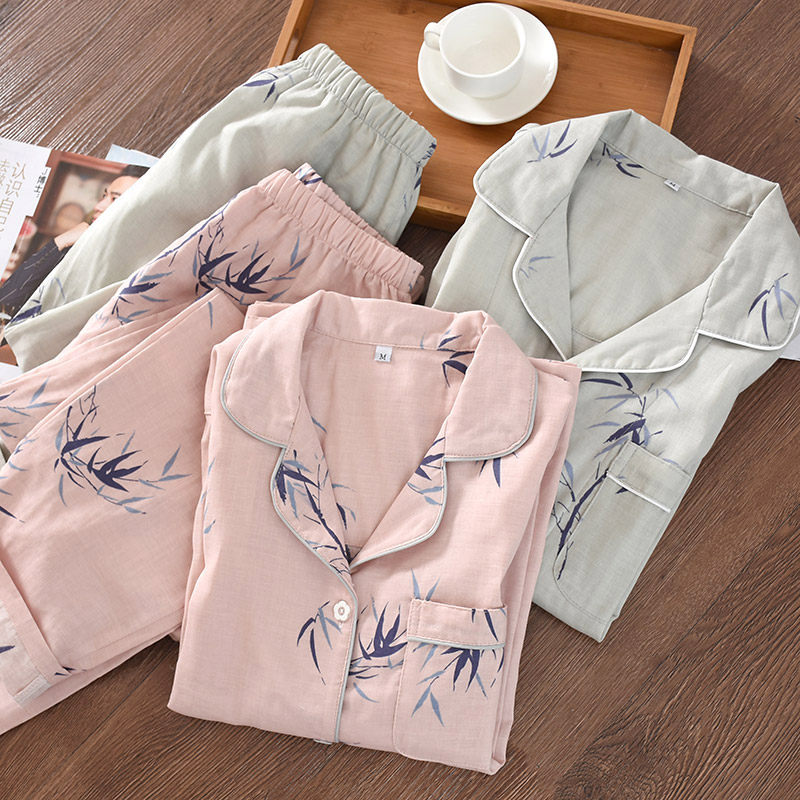 Couple cotton yarn pajamas for men and women spring and autumn pure cotton encrypted double-layer gauze unprinted sweet home clothes suit