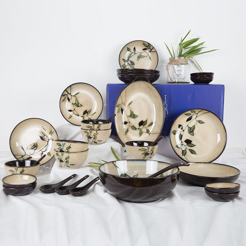 Yuquan bamboo leaf household ceramic bowls soup bowls instant noodles bowls rice bowls fish plate tableware creative hand-painted underglaze color combination