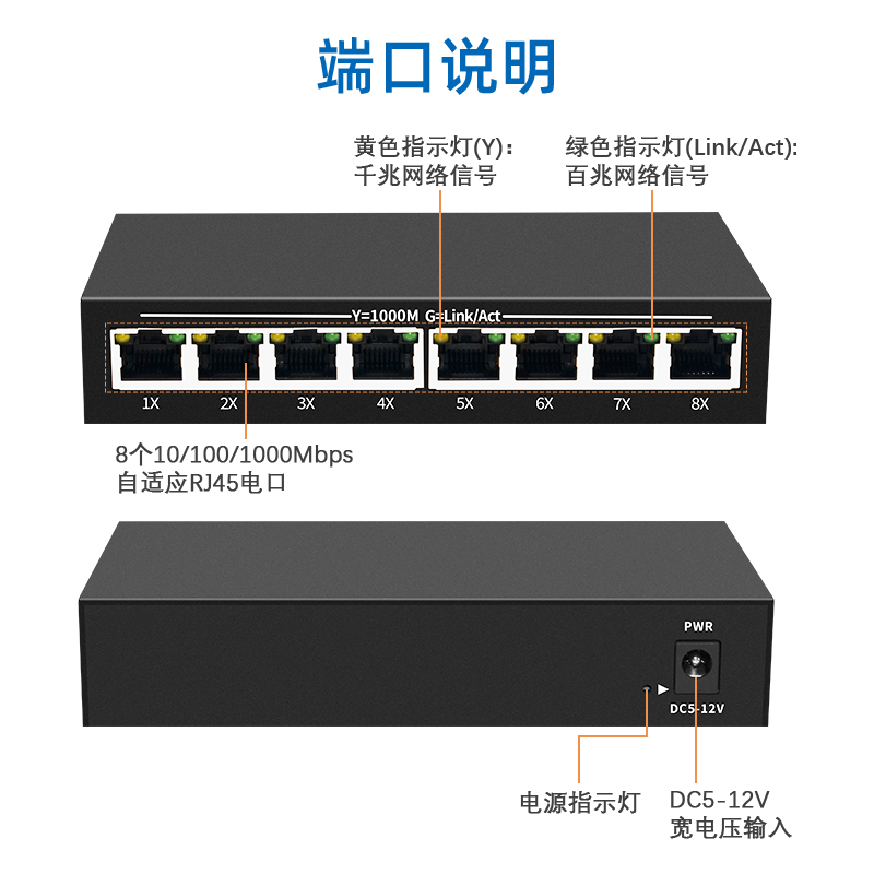 5 Port 8 Port full gigabit trillion ether network switch DC12V power supply security monitoring household wire flow