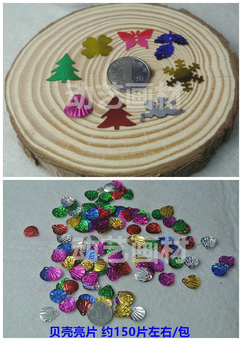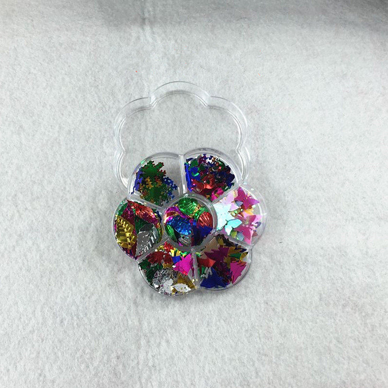 7 styles mix a box of 12 bottles mix a box of small shells bright sheet 2 packs (10 gr packs) large seashells sequin 2 packs (10 gr packs) maple leaf 2 packs (10 gr packs) Pearl pieces