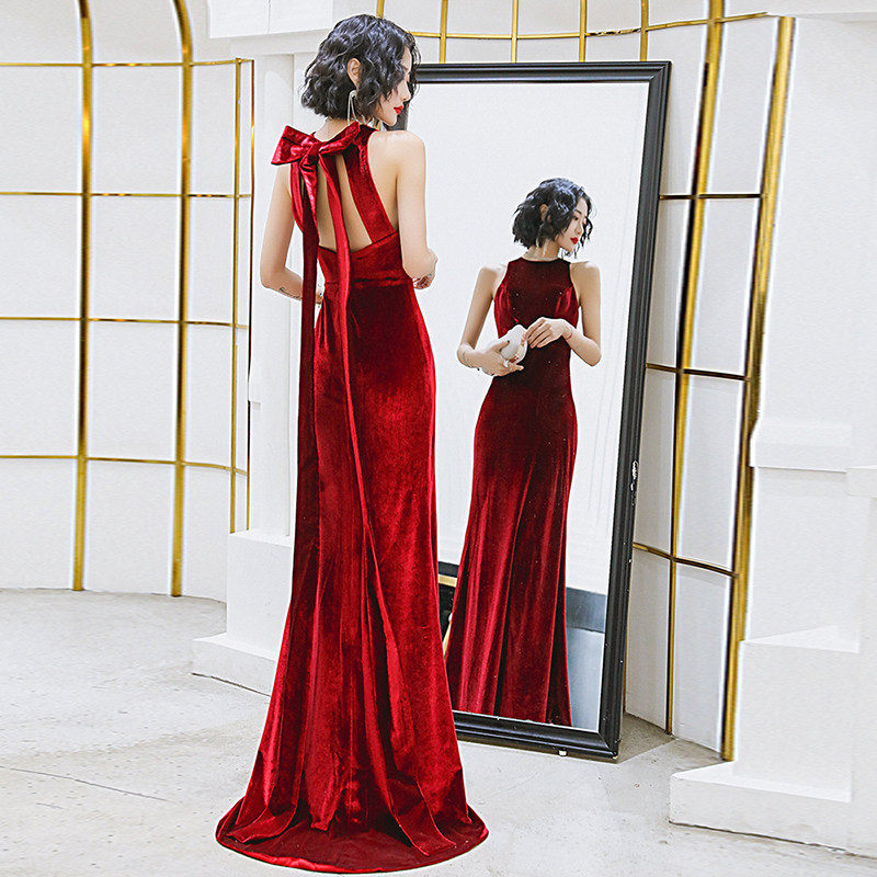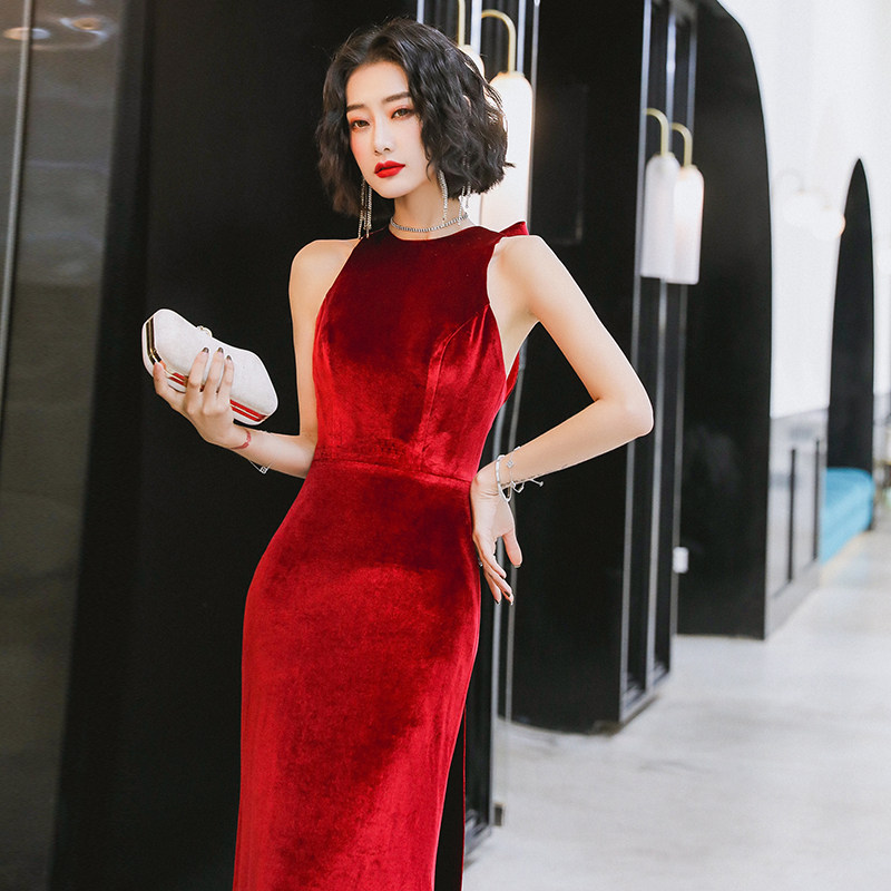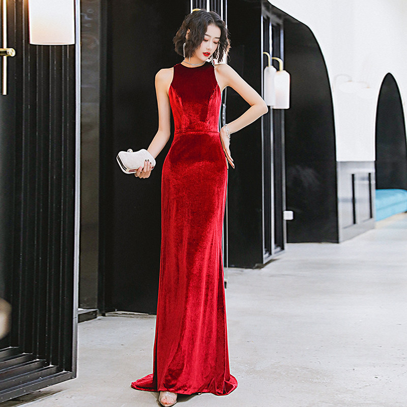 Evening dress women 2020 new noble burgundy velvet elegant long version of the host annual meeting dress slim and thin