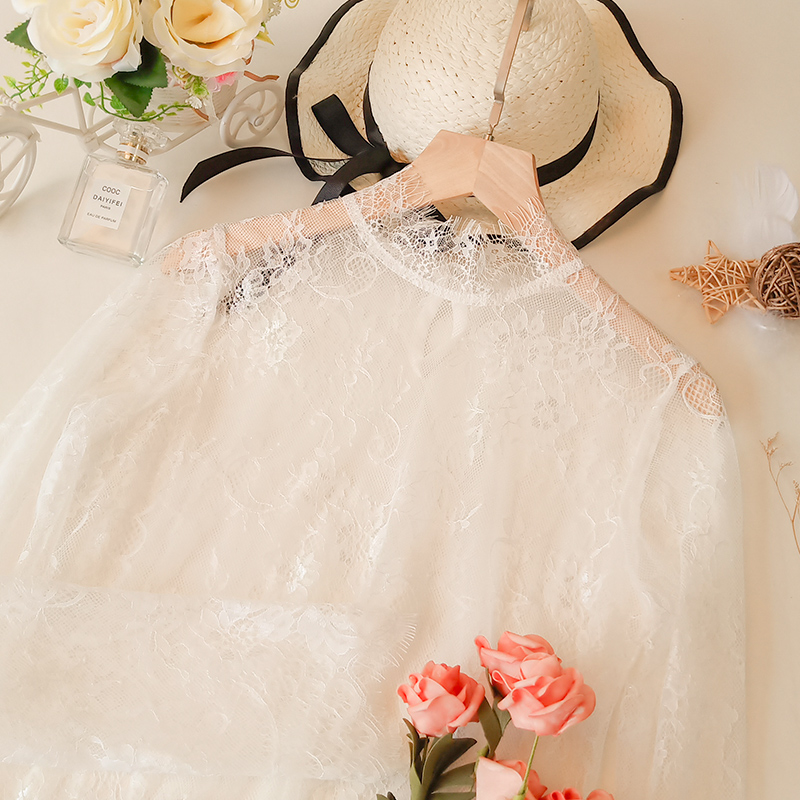 Tight lace base shirt Women's long-sleeved large size yarn clothes with mesh transparent fairy top women's perspective temperament