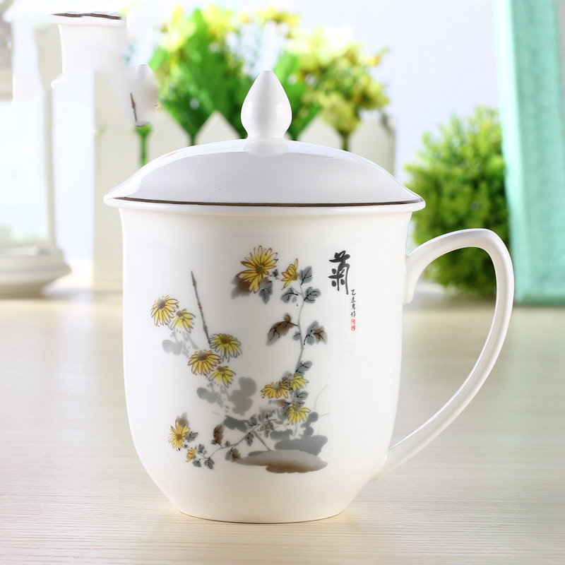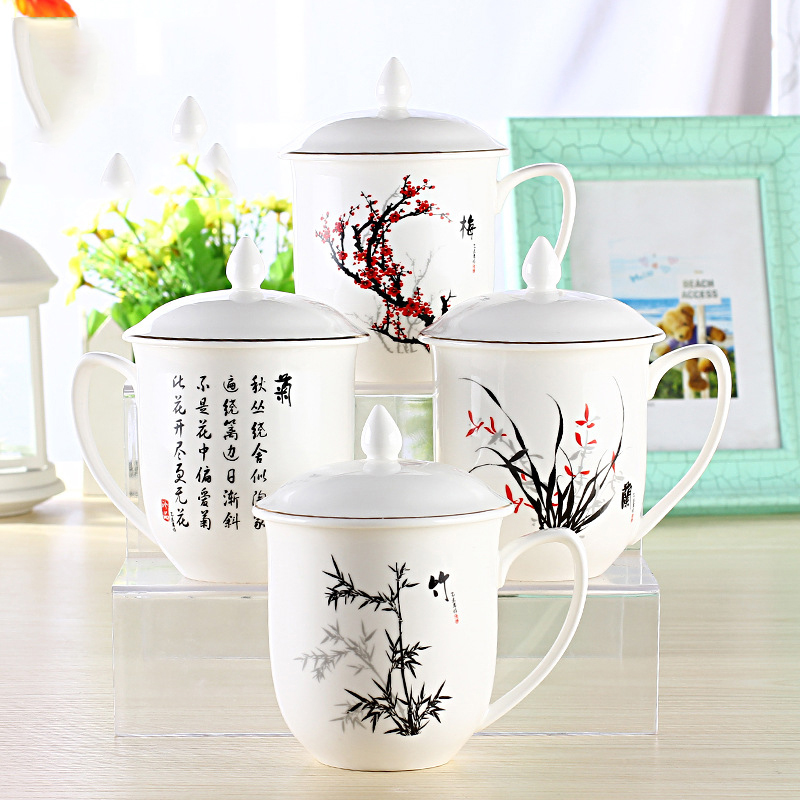 (4pcs)Meilan Bamboo Chrysanthemum Ceramic Teacup with lid Office Conference Cup Household Water Cup Cup Set
