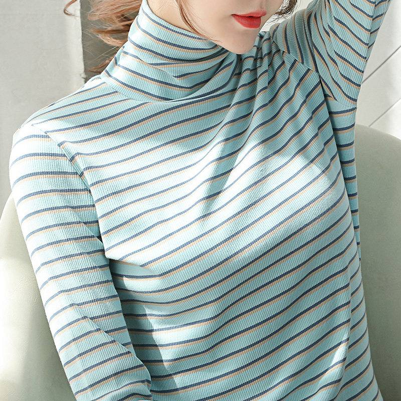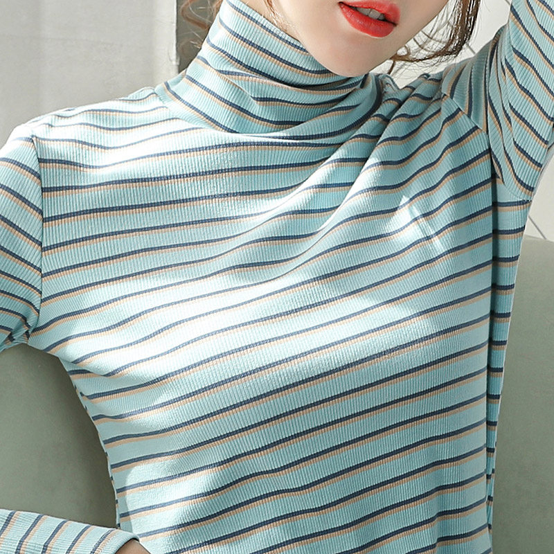 High collar striped inside lap dresses 2021 Early autumn new Korean version 100 lap pure cotton T-shirt woman long sleeve clothes inside lap