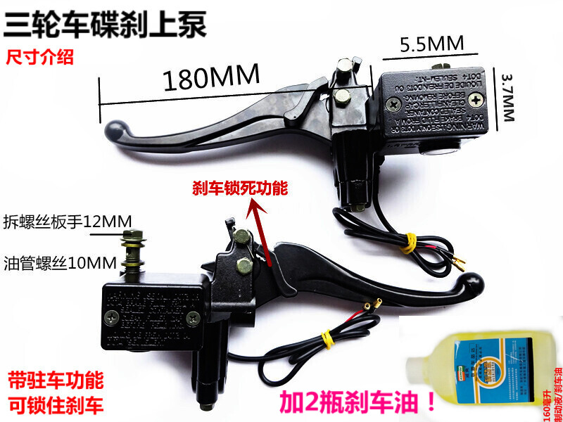 Three-wheeler upper pump (left) Tricycle Upper Pump (right) Tricycle Upper Pump (left) A pair of three-wheeler upper pump (left) brake oil 1 bottle of tricycle upper pump (right) brake oil 1 bottle of three