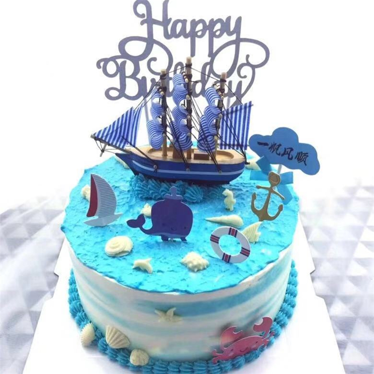A smooth birthday cake decorated with sailboat small ornaments baked large Mediterranean wooden hull models