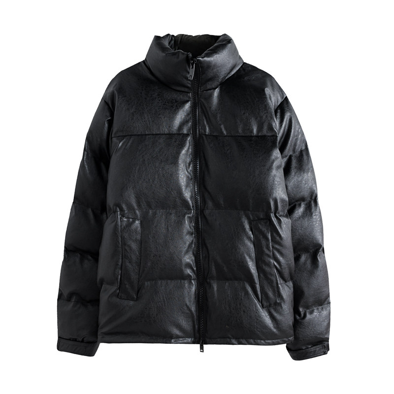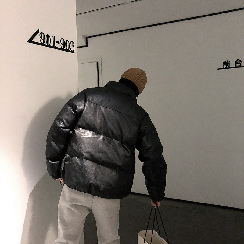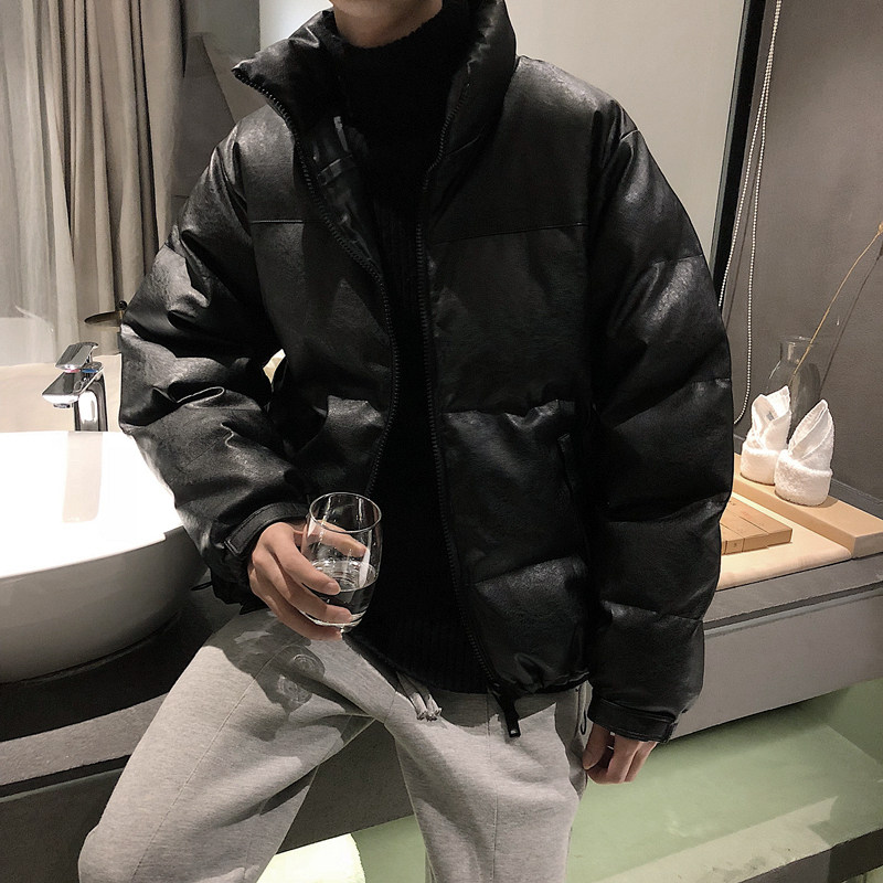 Anti-season clearance#winter black PU lint coat ins net red Korean version of stand-up collar bread cotton clothes men fried street coat tide