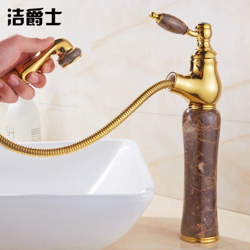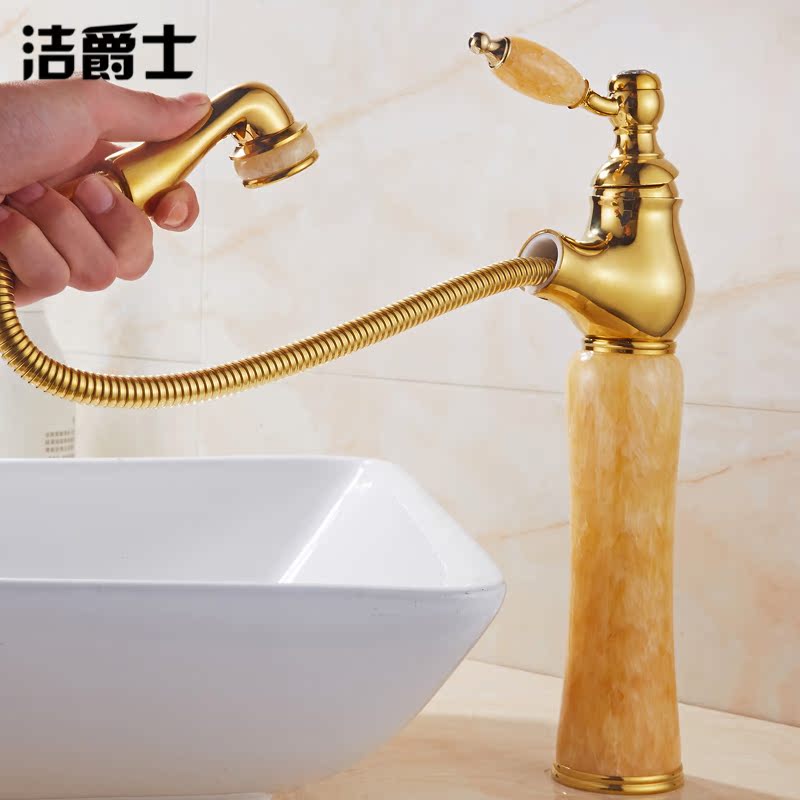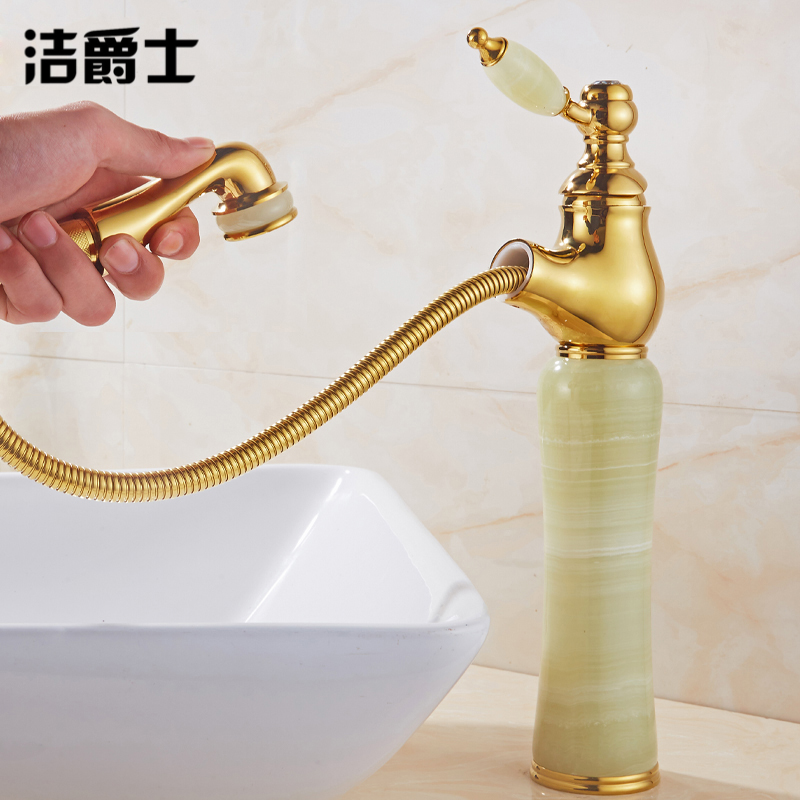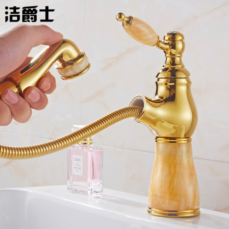 Clean jazz European-style full copper natural jade face basin pull-out cold and hot tap terrace pelvic gold telescopic tap