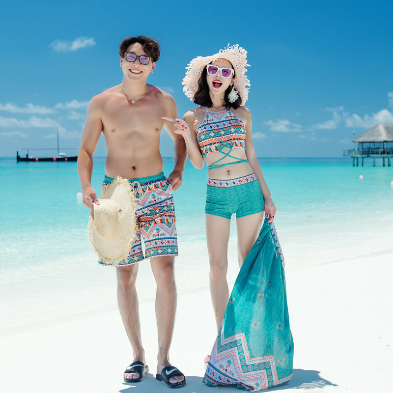 Couple swimsuit ins beach seaside 2021 new men's and women's set flat angle long skirt honeymoon resort ethnic swimsuit