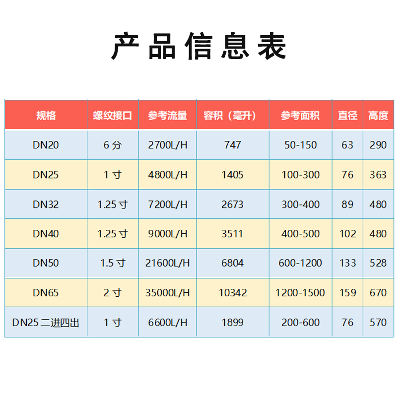 DN20 No Accessories DN25 No Accessories DN32 No Accessories 40 Model Interface DN32 No Accessories 50 Model Interface DN40 No Accessories65 Model Interface DN50 No Accessories DN25 (Two In Four Out) No Accessories DN20 Insulation Sleeve + Bracket DN25 Insulation Sleeve + Bracket DN32 Insulation Sleeve + Bracket DN40 Thermal Insulation Sleeve + Bracket DN50 Thermal Insulation Sleeve + Bracket DN65 Insulation sleeve + bracket DN25 (two in and four out) insulation sleeve + bracket DN20 full set DN25 full set DN32 full set 40 model interface DN32 full set 50 model interface DN40 full set 65 model interface DN50 full set DN25 (two in and four out) full set of exhaust valve drain valve 1 inch (DN25) inner wire double active joint
