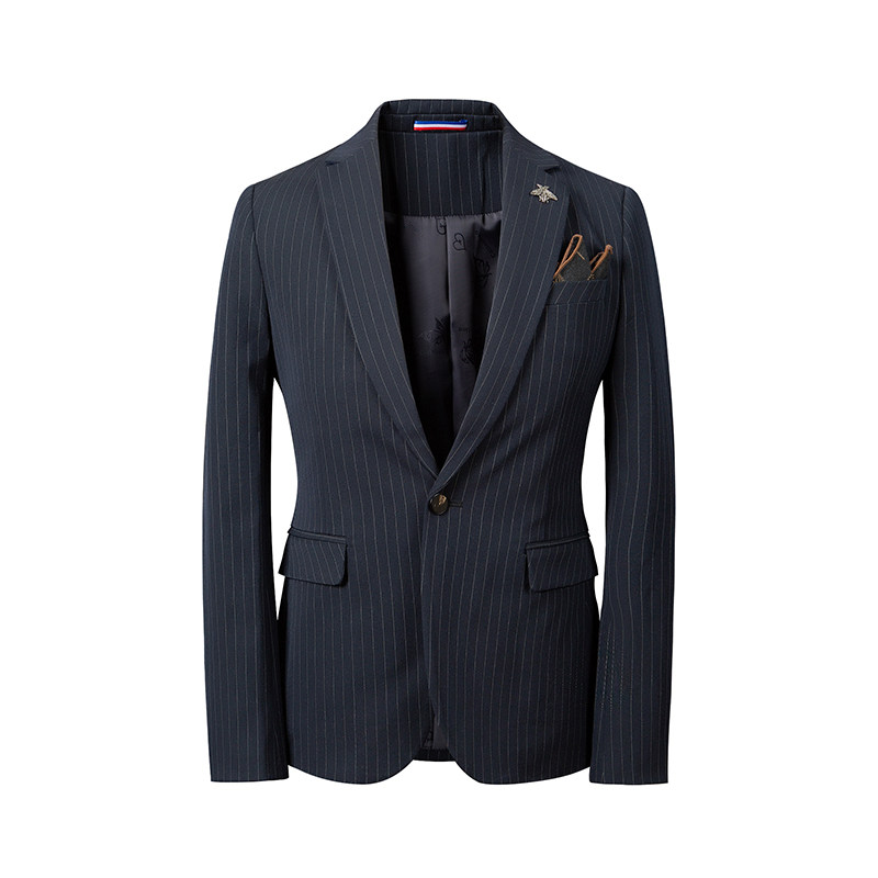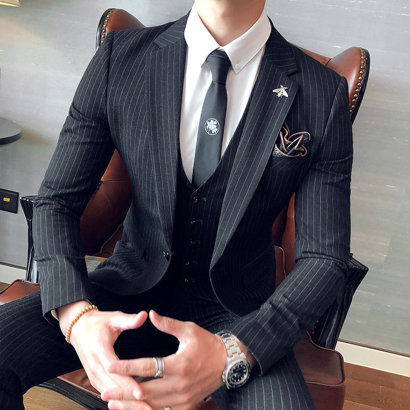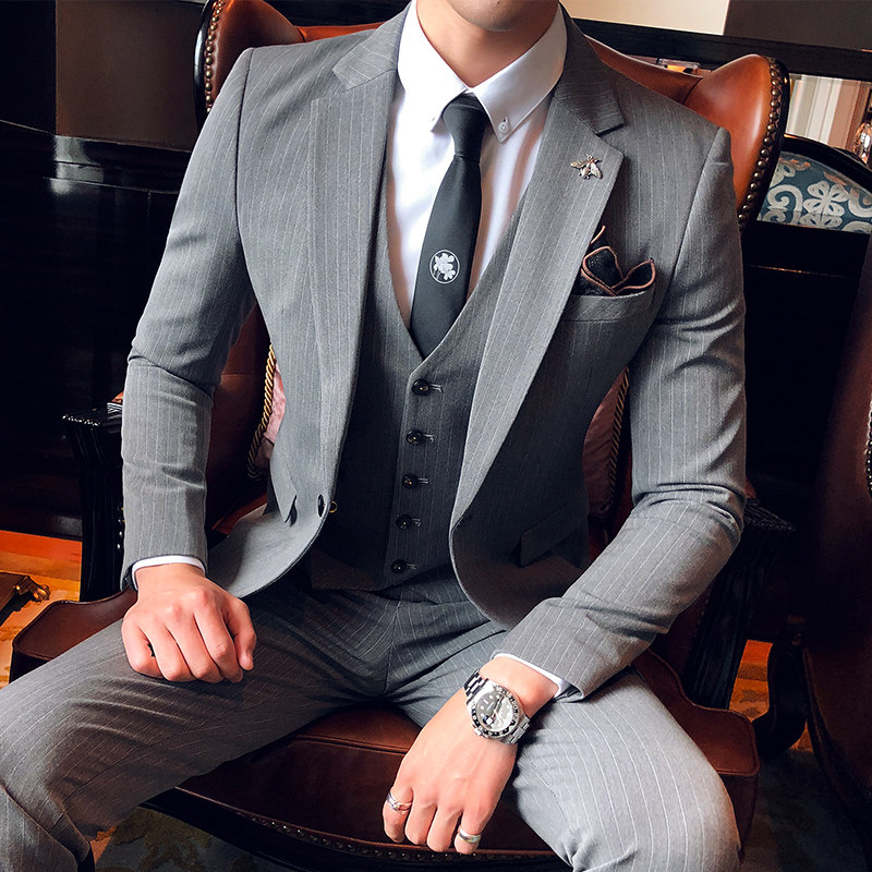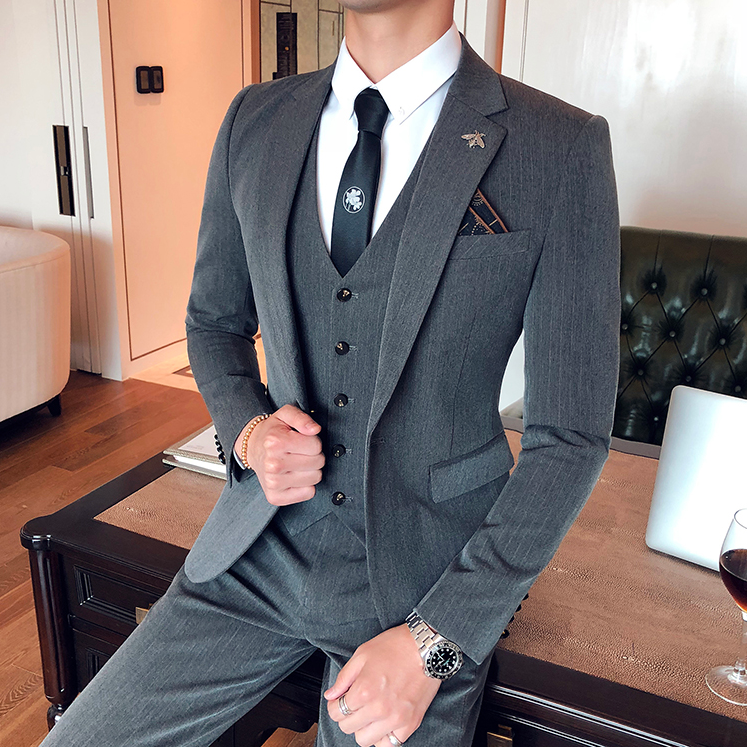 Western suit suit men's three sets of Korean version for a casual positive dress groom wedding gown Inn striped small suit