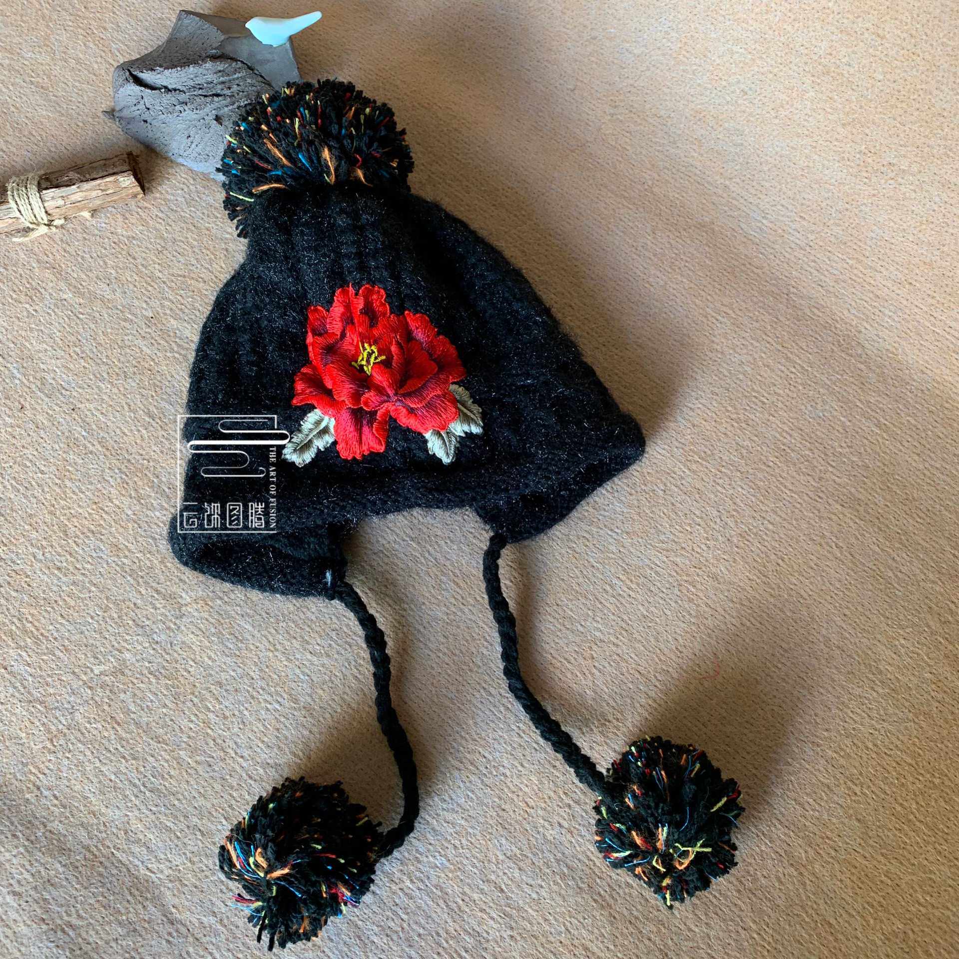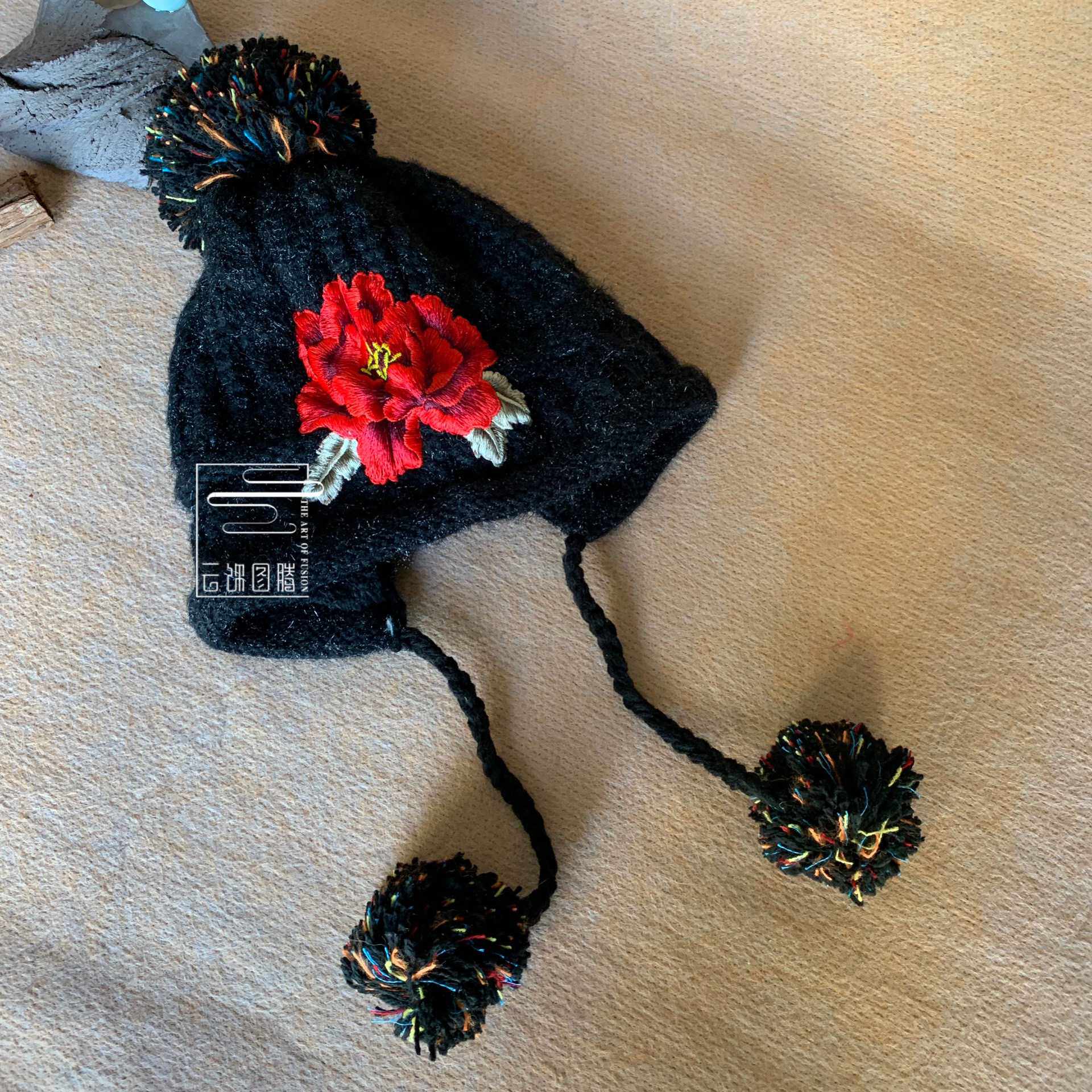 Cloud decorated totem original design warm wool hat autumn and winter ethnic embroidery peony plus Velvet Ear pompom hat