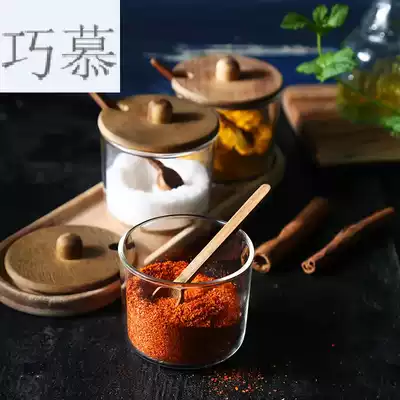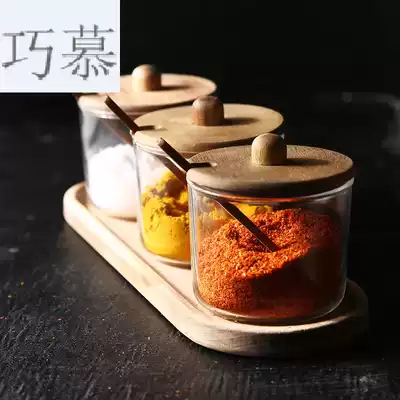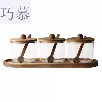 AT triple seasoning box Acacia wood lid seasoning storage jar with tray Kitchen glass salt jar Seasoning jar