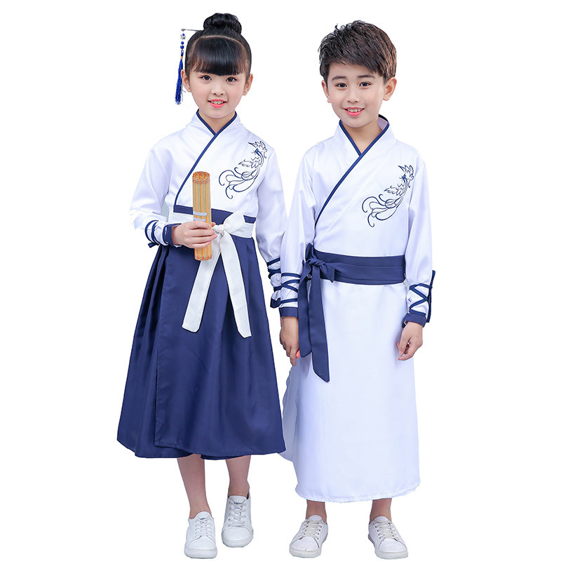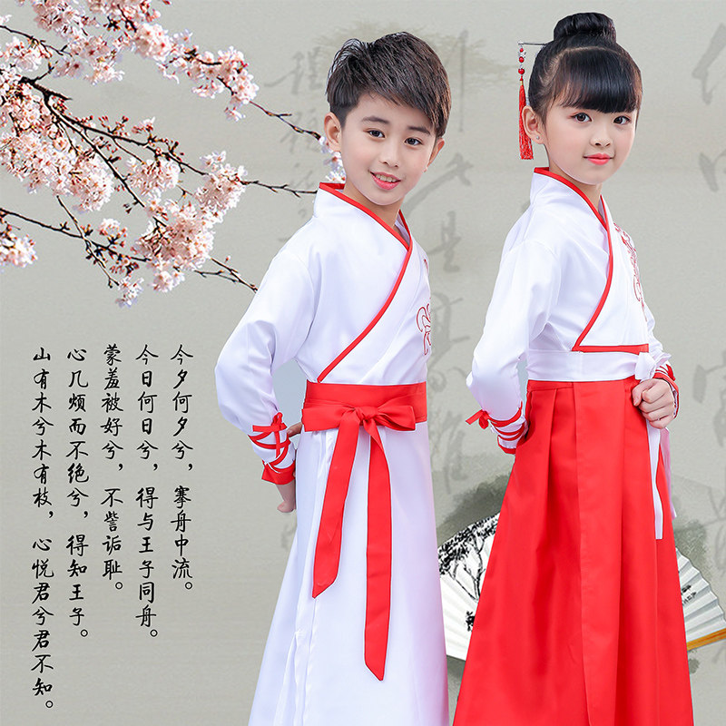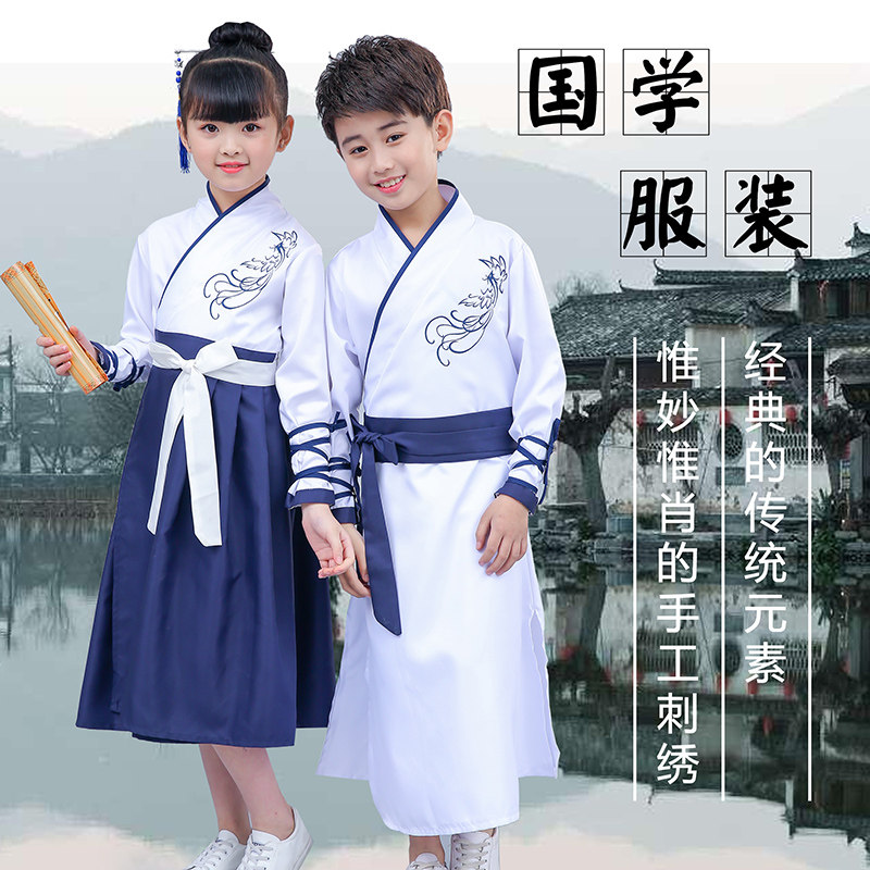 New Year's Day Dance National School Three words of children's ancient clothes Chinese wind Han clothes men and women reciting a book child performance