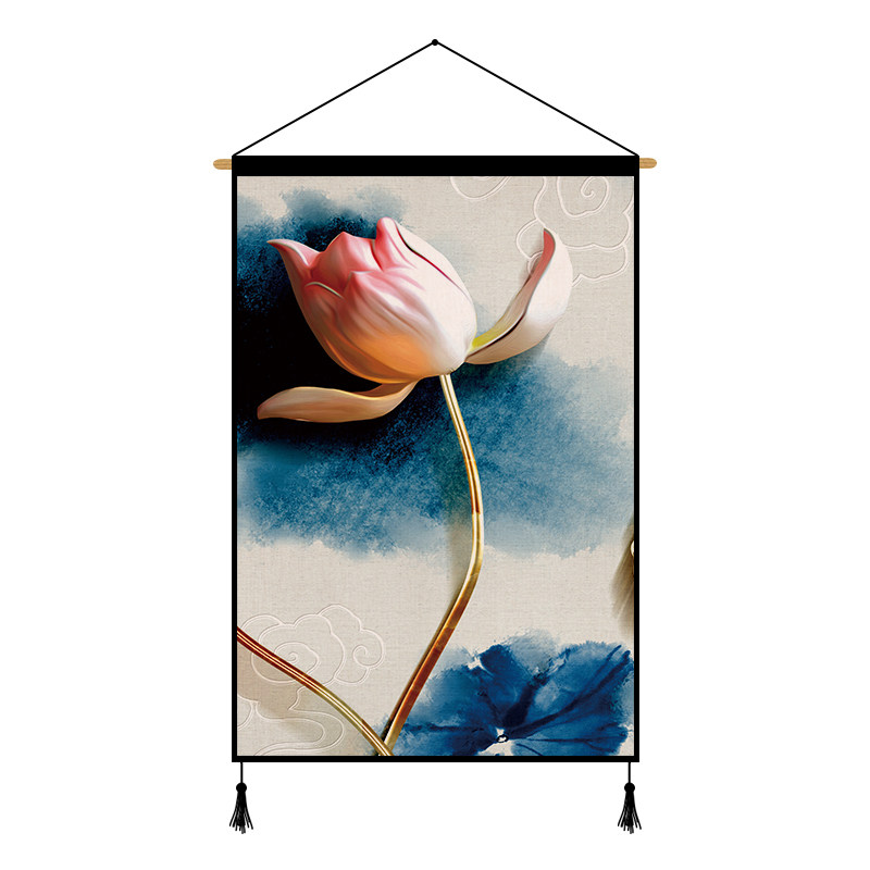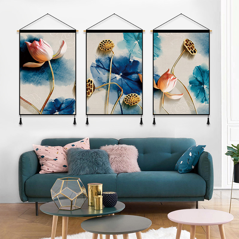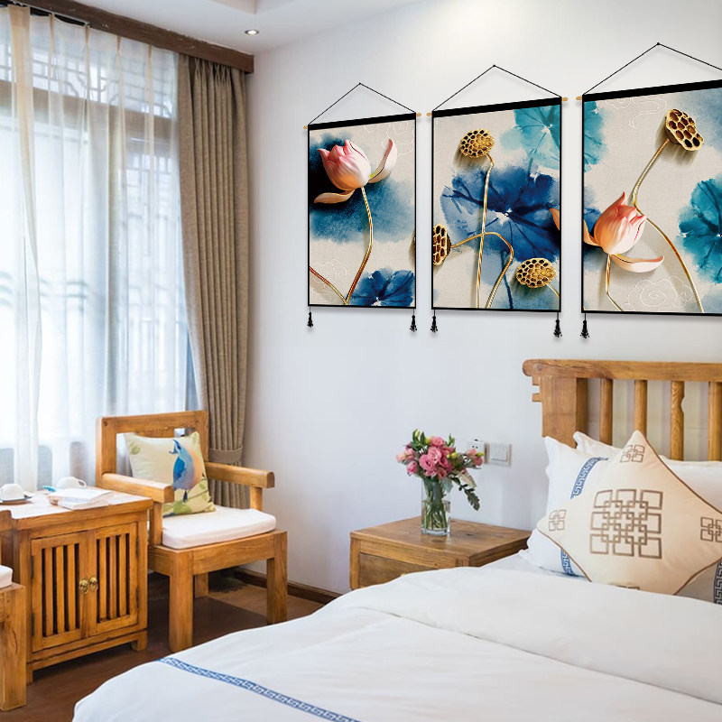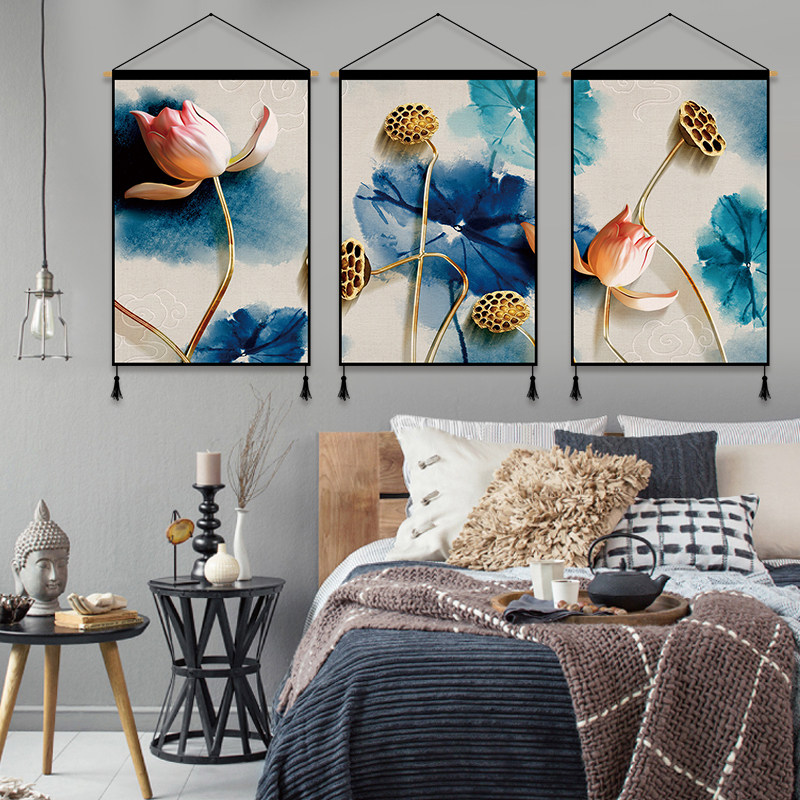 New Chinese Lotus Fabric Hanging Painting Living Room Sofa Backwall Decorative Painting Dining Room Bedroom Tapestry Wall Painting Covering Cloth