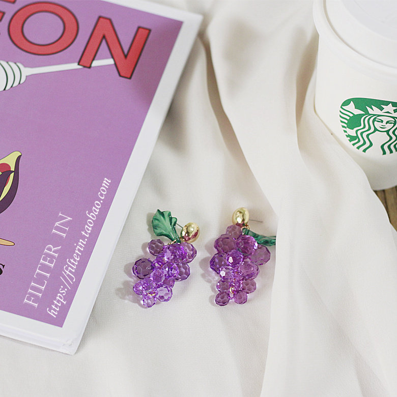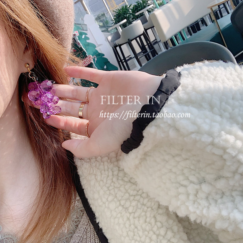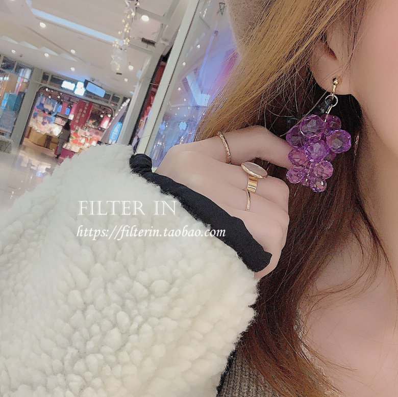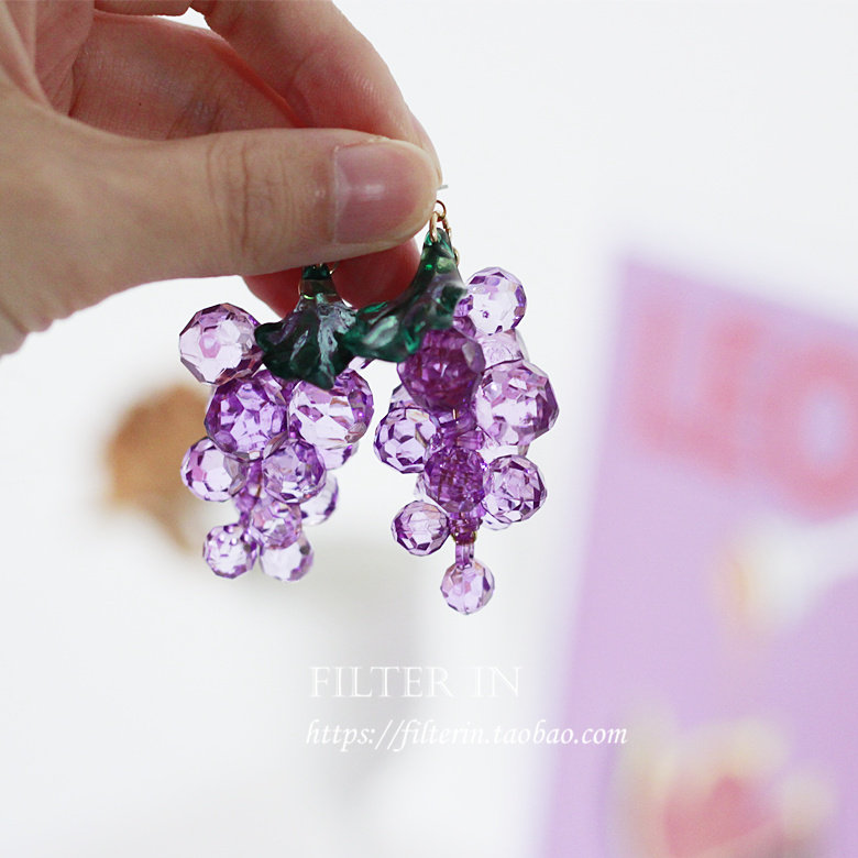 With filter, hand-made crystal clear bunch of purple grape earrings, ear clips, fruit boy ~ Lin Xiaozhai with the same style