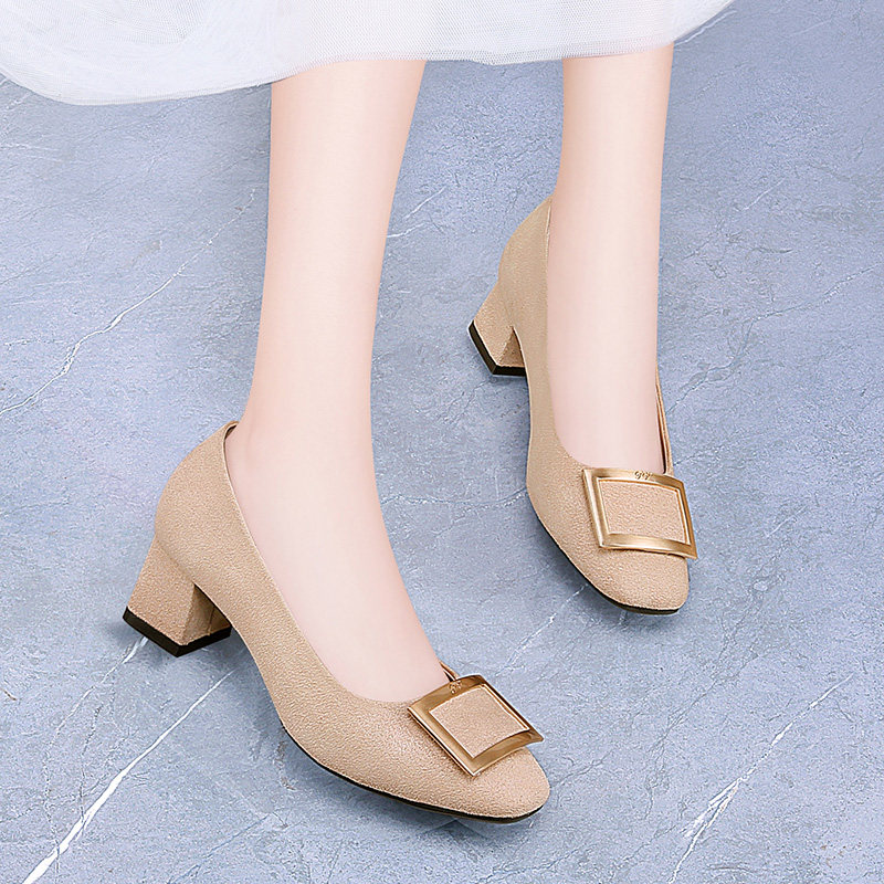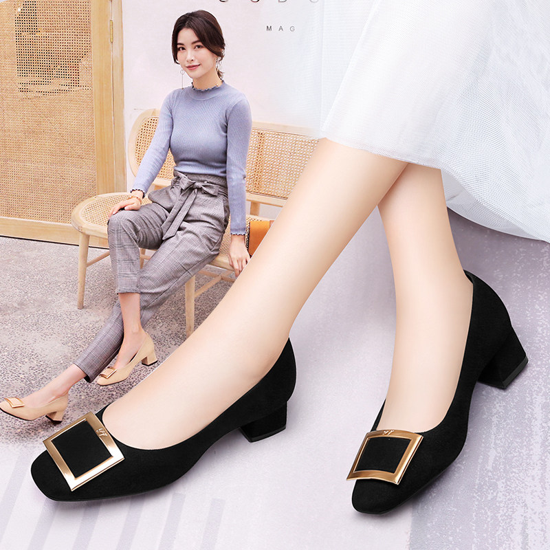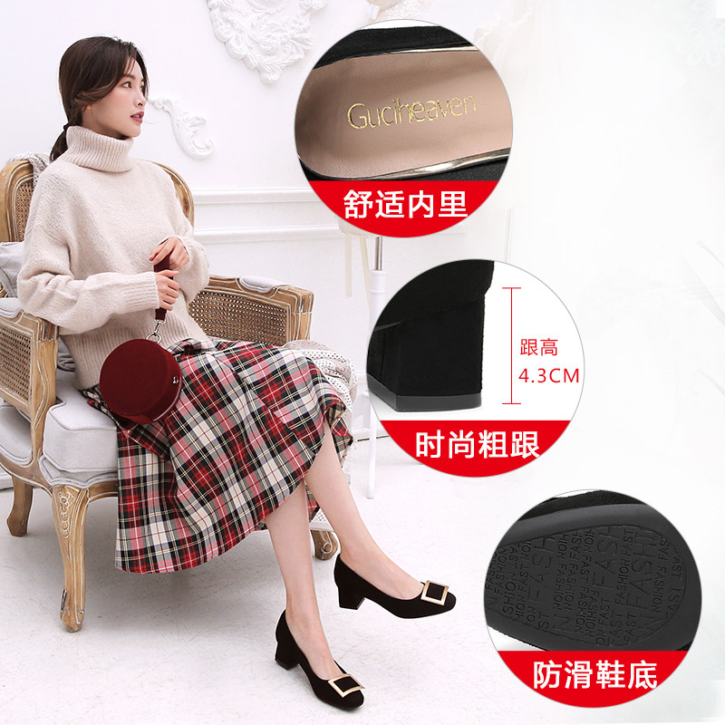 Single shoe woman in heel ladyshoe 2022 new summer and light mouth black leather leather square head summer rough heel to work high heel shoes