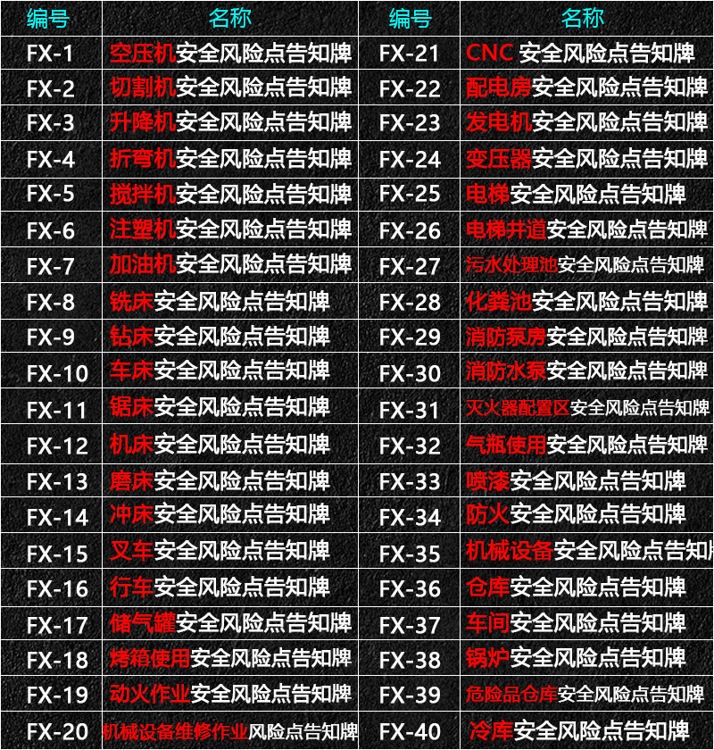 (PVC plastic board) air compressor to inform brand FX-1 (PVC plastic board) cutting machine risk to inform brand FX-2 (PVC plastic board) elevator risk to inform brand FX-3 (PVC plastic board) bending machine risk to inform brand FX-4 (PVC plastic board) mixer risk to inform brand FX-5