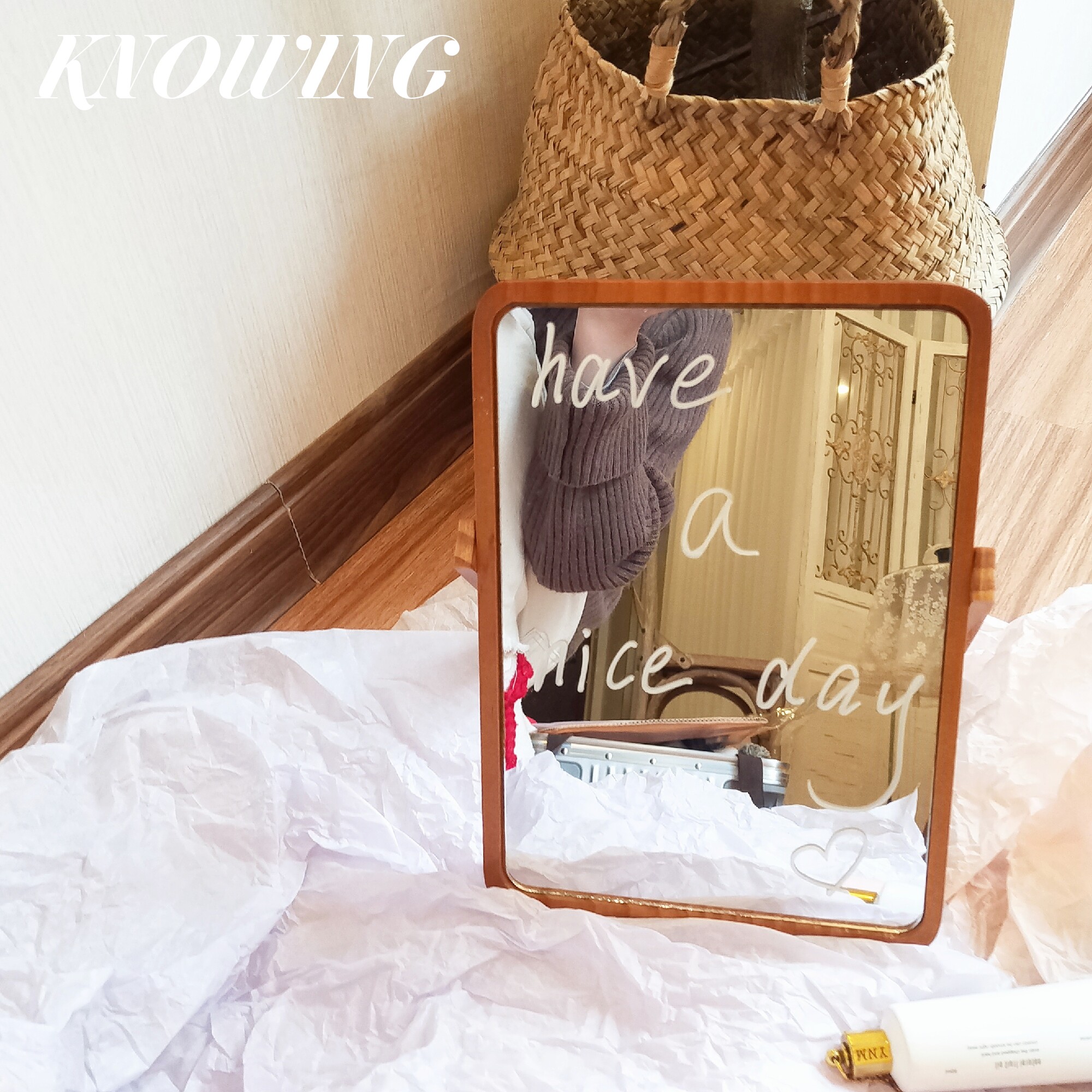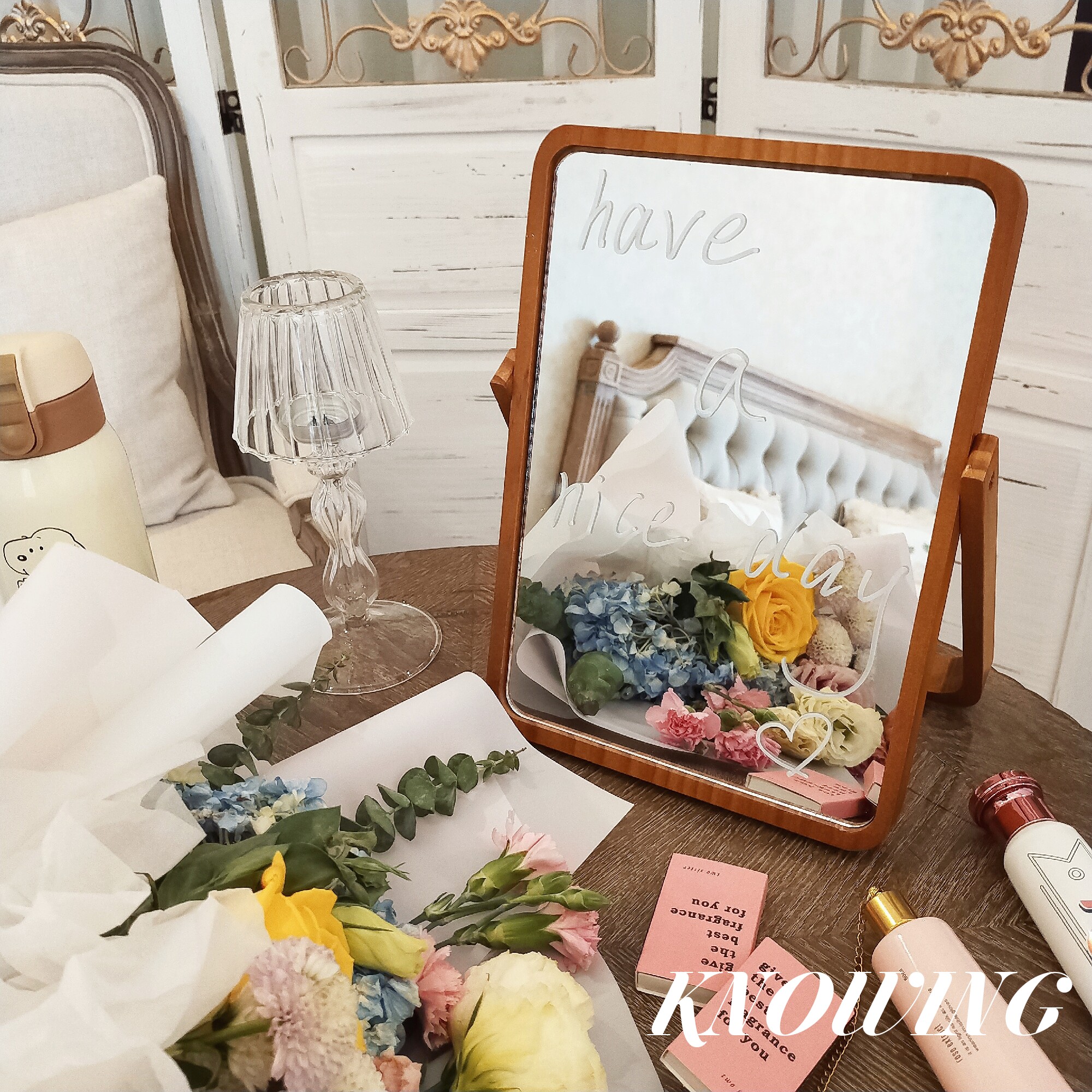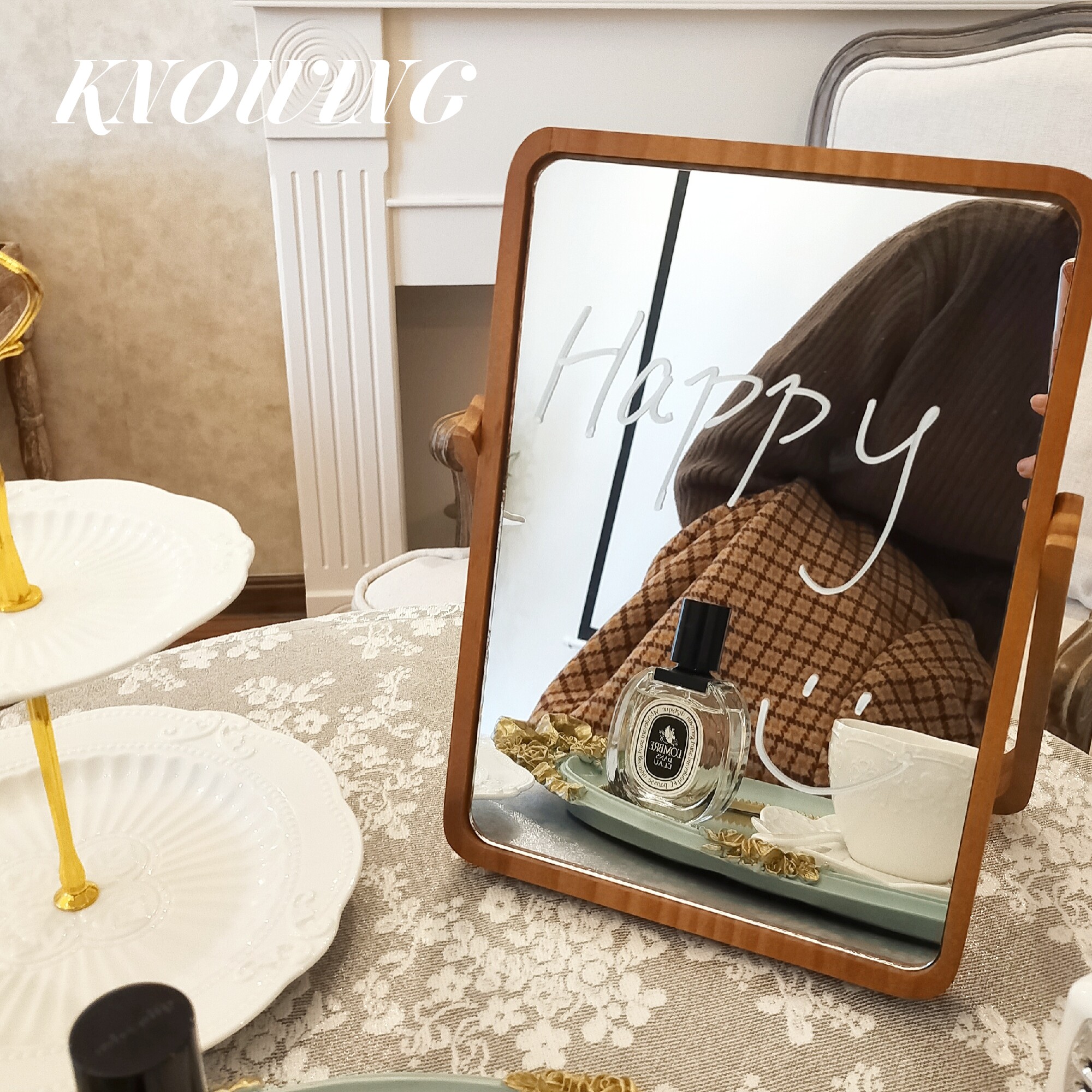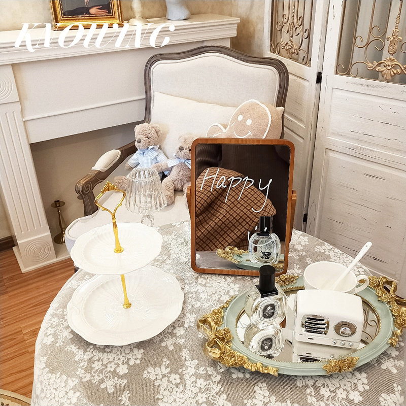 KNOWING retro ins large desktop HD wooden makeup mirror Student desktop mirror folding dormitory single-sided