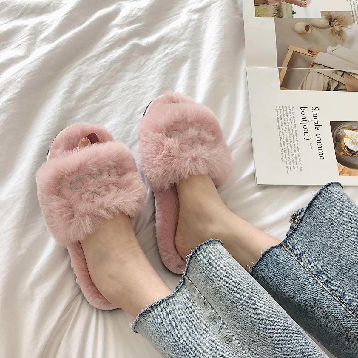 Fine strip Net red same 2020 autumn and winter Korean fashion fur slippers women wear Joker thick cotton slippers