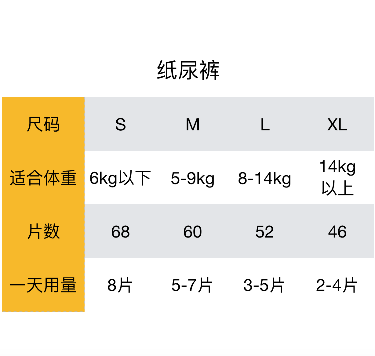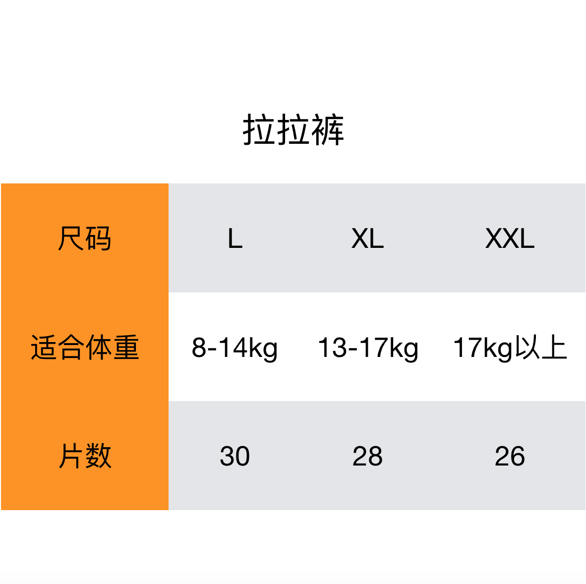 L (8-14kg) 30 pieces XL (13-17kg) 28 pieces XXL (above 17kg) 26 pieces S (below 6kg) 68 pieces M (5-9kg) 6 pieces