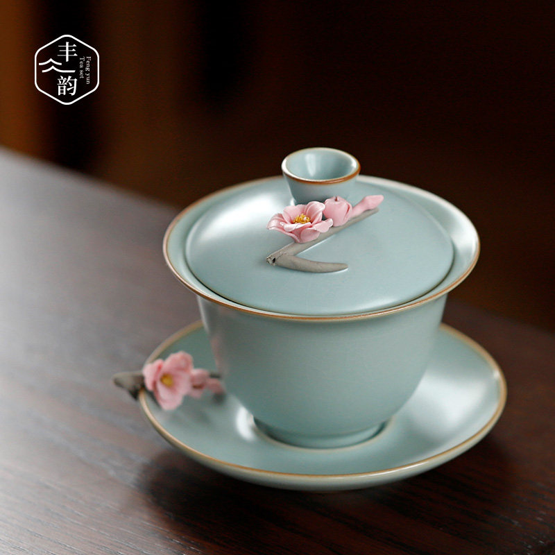Ruyao Tianzun Large Gaiwan Ruyao Fuqing Anti-mouth Gaiwan Sky Blue Ruyao Yanyan Gaiwan with Plum Blossoms