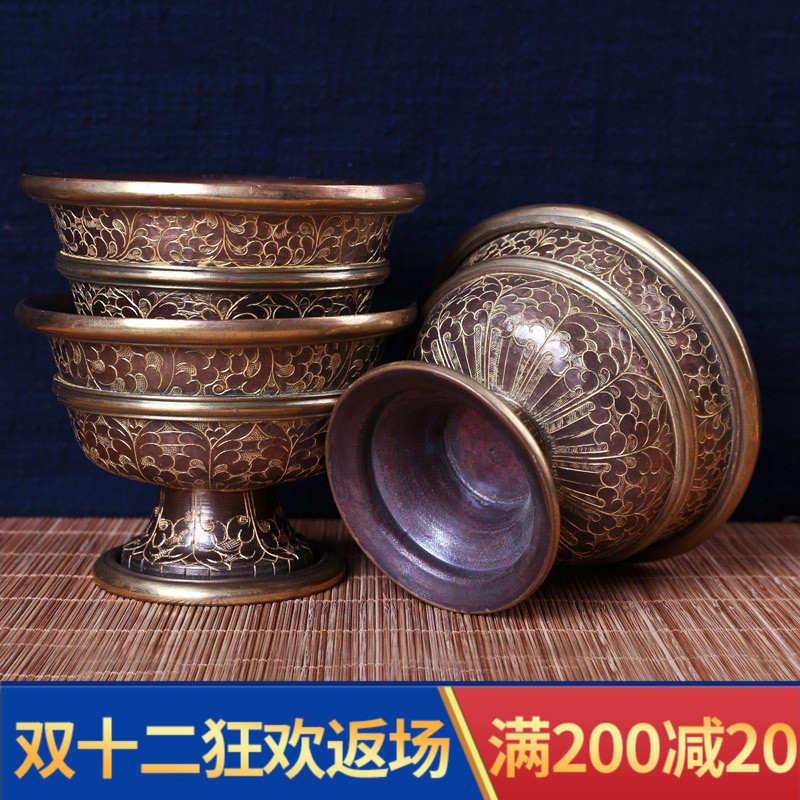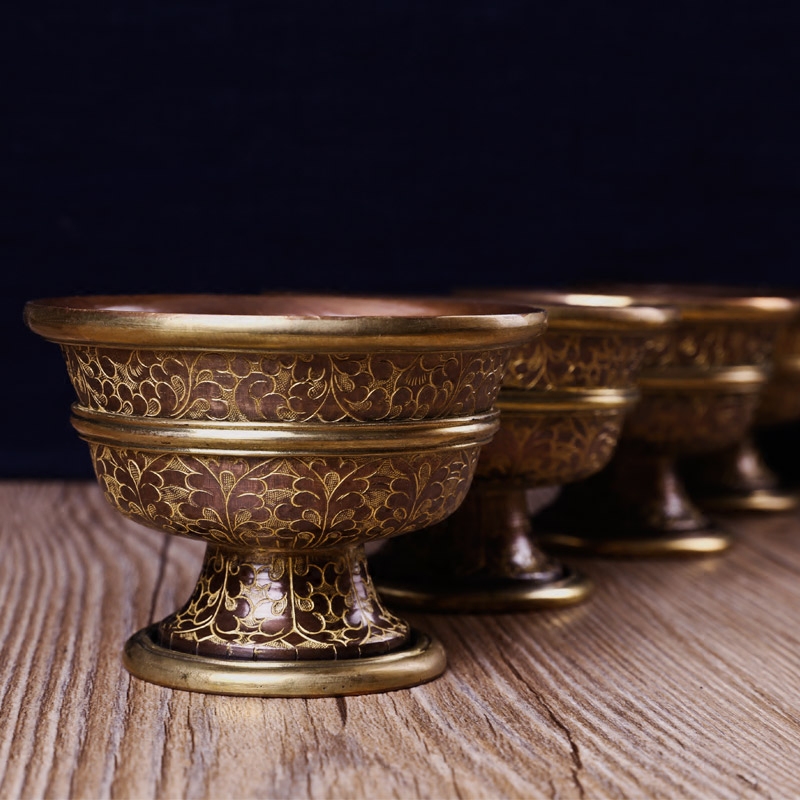 Nepal Pure Handcrafted Sketch Gold Sculpture Flower Water Bowl Red Copper Water Supply Bowl Holy Water Cup Small set of 7