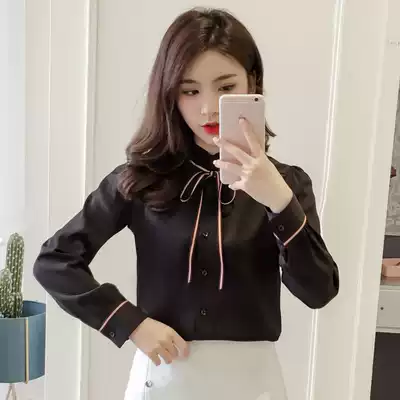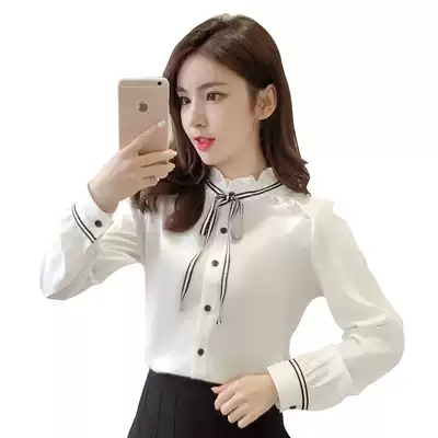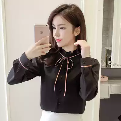 2021 spring and autumn new long-sleeved ribbon chiffon shirt women's wooden ear edge stand-up collar shirt all-match bottoming top small shirt