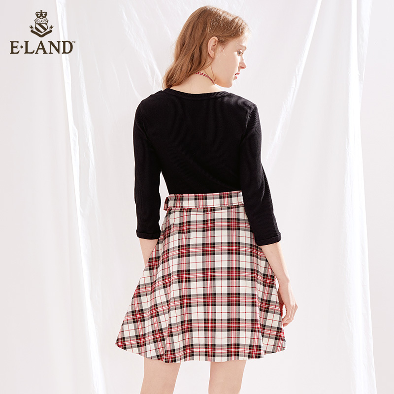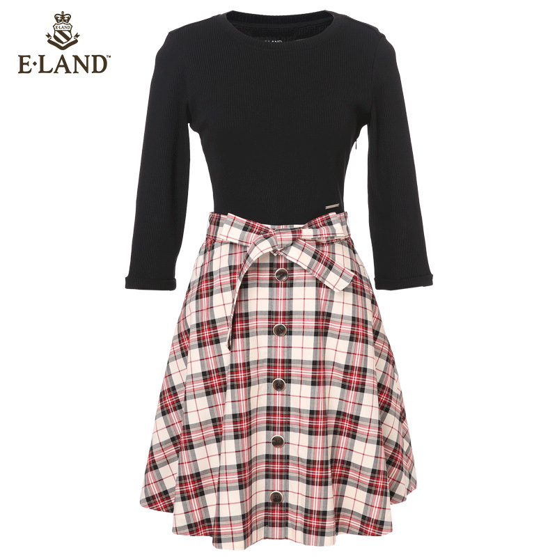 ELAND clothing love spring and autumn season sweet temperament fake two-piece stitching bow lace-up plaid thin dress woman