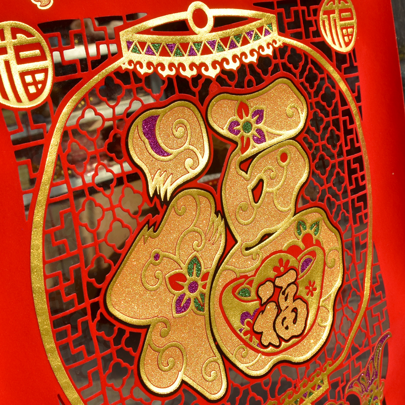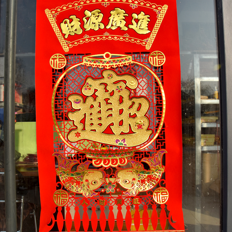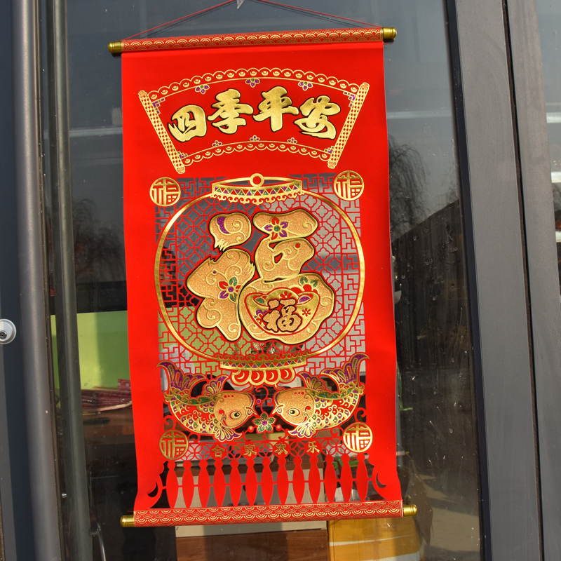 2021 New Year of the Ox New Fu word hanging painting hanging shaft velvet cloth hollow bucket side hot gold Fu paper-cut living room decoration painting