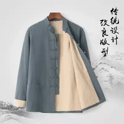 Autumn clothes for middle-aged and elderly men's long-sleeved cotton and linen Tang clothes Chinese style linen Hanfu Chinese plate buckle lay suit jacket