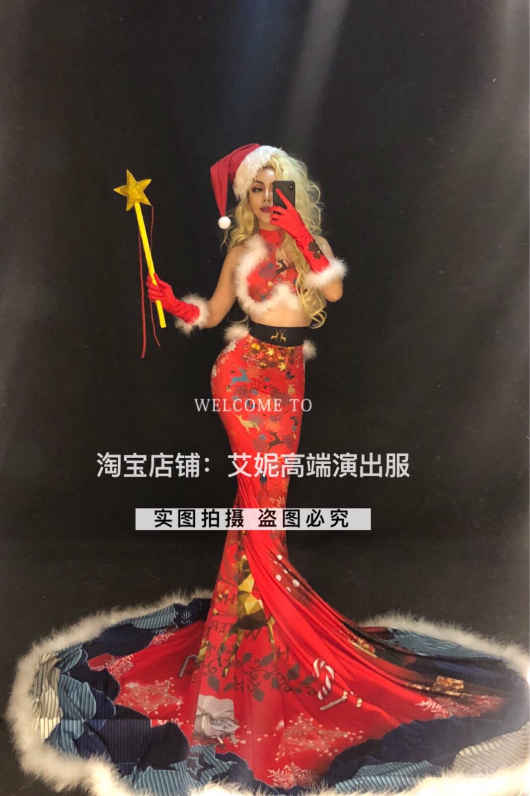 TT nightclub bar singer djds dance team gogo Christmas red one-piece trailing dress costume
