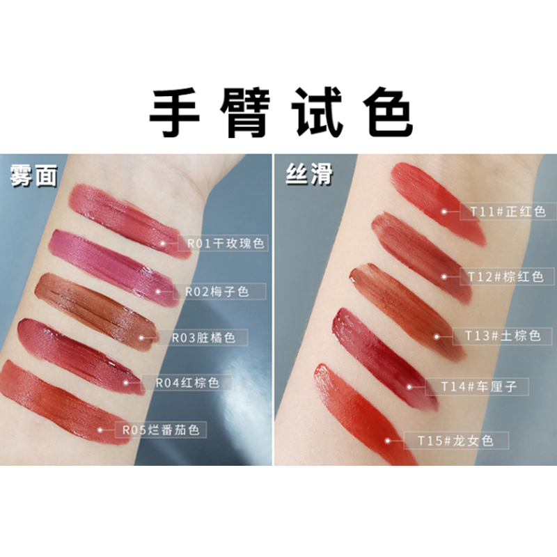 Matte R01 Dry Rose Matte R02 Plum Matte R03 Dirty Orange Matte R04 Red-brown Matte R05 Rotten Tomato Silky T11 Red Silky T12 Red-brown Silky T13 Earth Brown