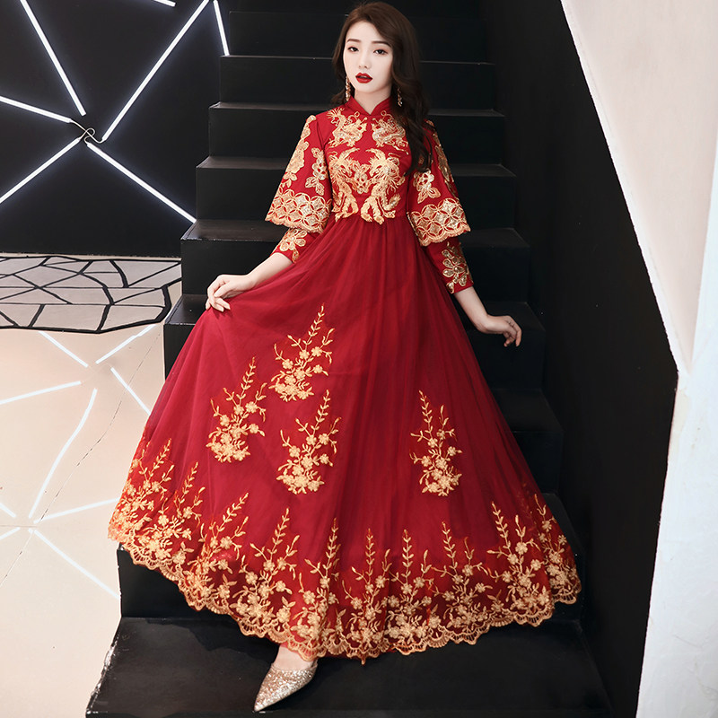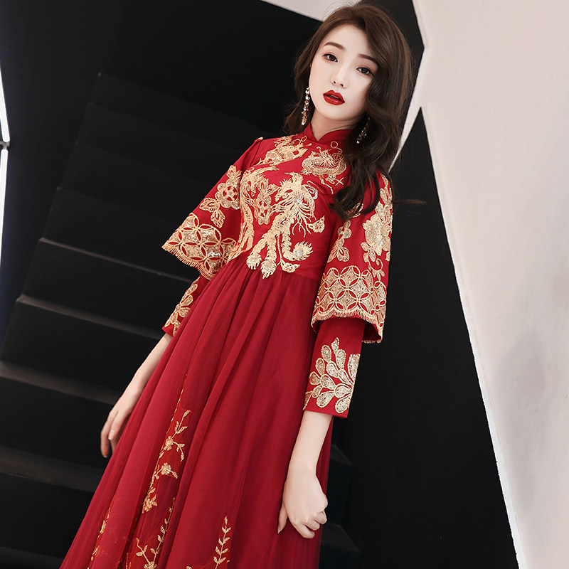 Pregnant woman toast dress Bride high waist belly cover wine red long sleeve Chinese Xiuhe dress Wedding large size fat mm dress female