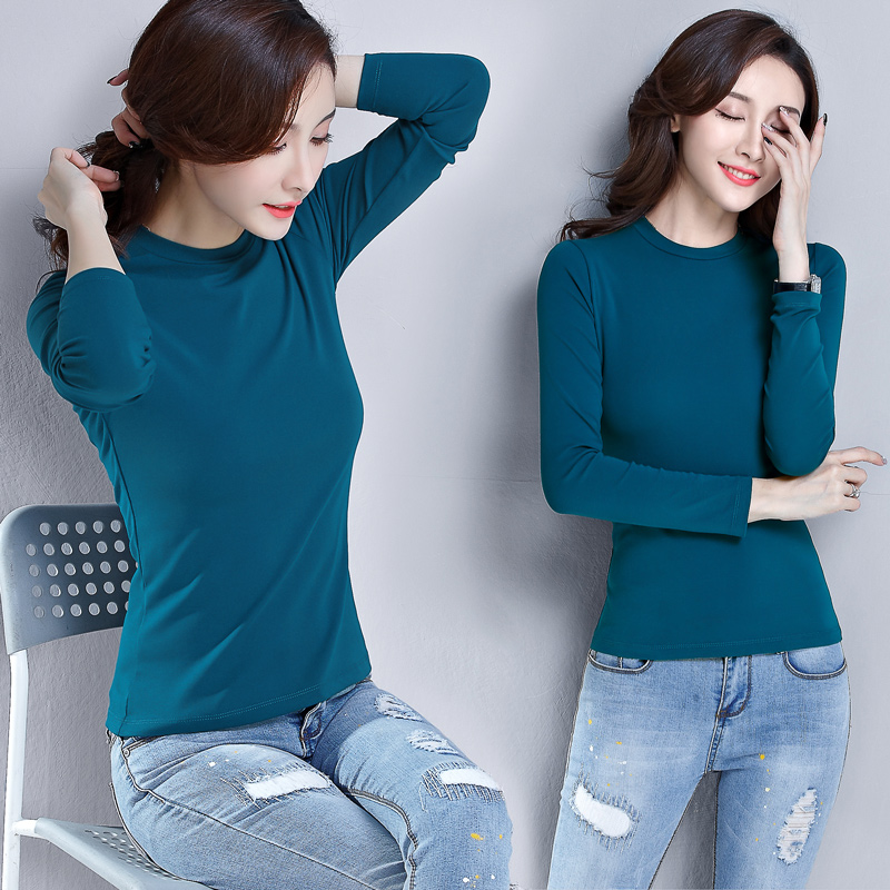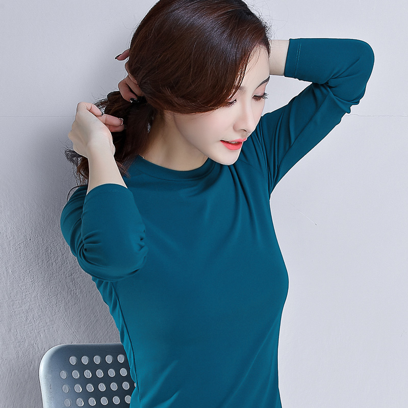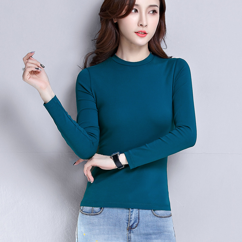 Peacock blue round neck semi-high neck base shirt with large size long-sleeved T-shirt women's 2021 new spring blood short section