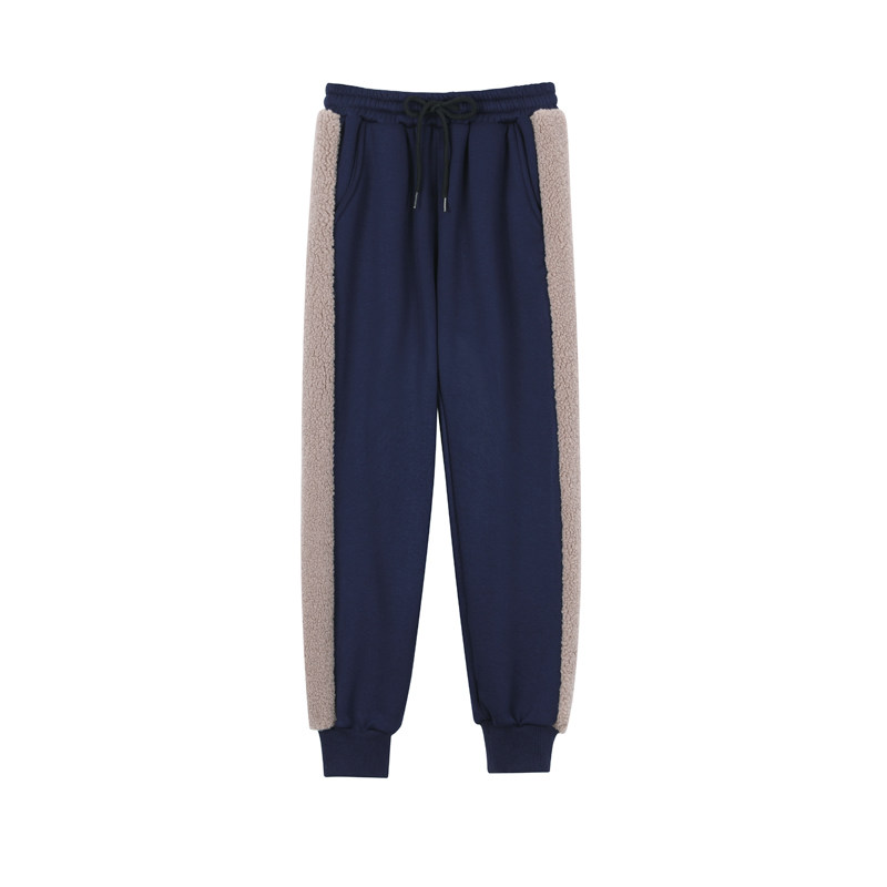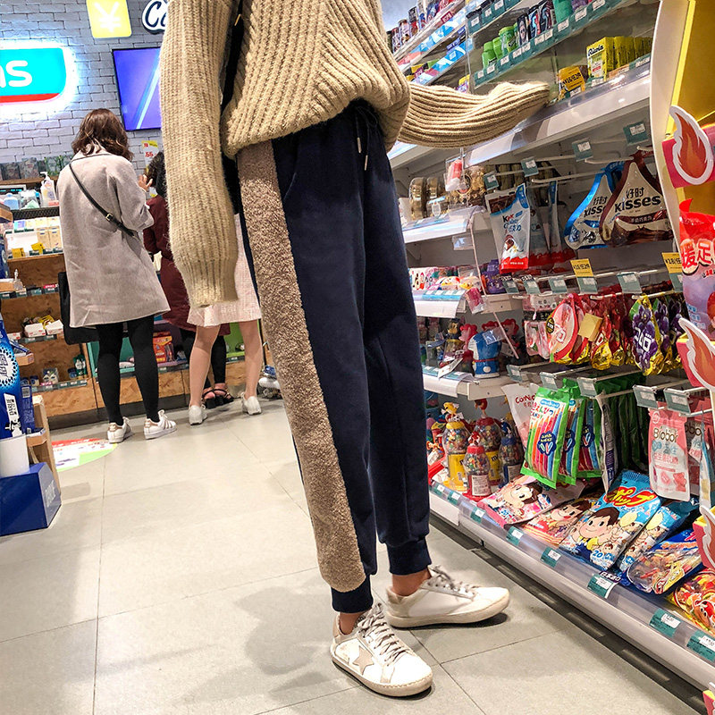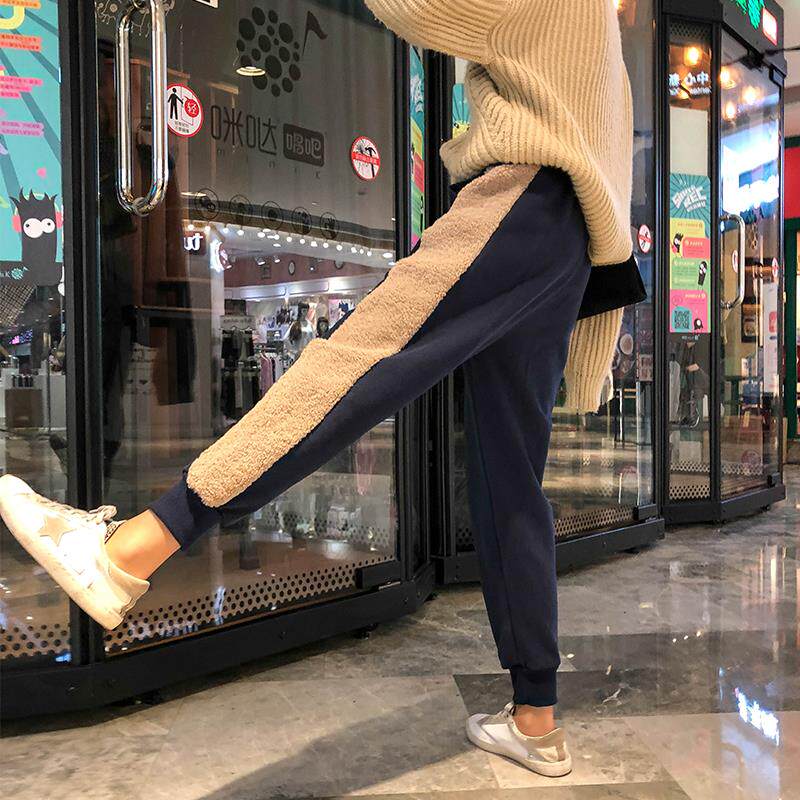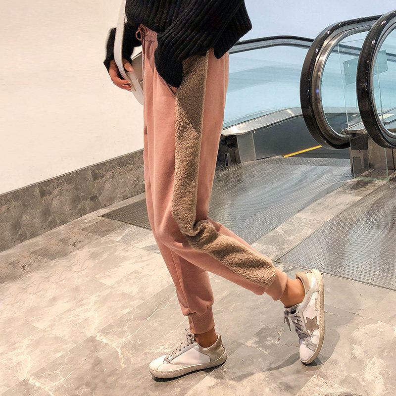 Tide Cards Winter Style Plus Suede Sports Women Pants Splicing Sheep Lamb Thickened High Waist Pumping Rope Loose Khalen Trousers Children