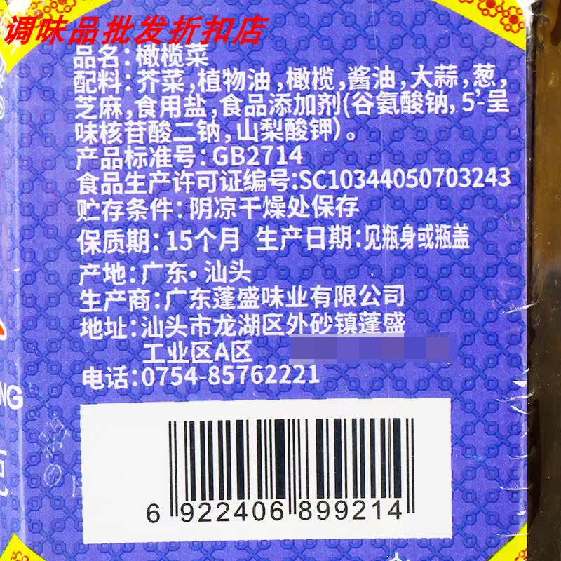 Mustard Plant Oil Olive Sesame Edible Salt Food Additives (Sodium Glutamate Sorbic Potassium) etc. with the actual information of the product outer packaging