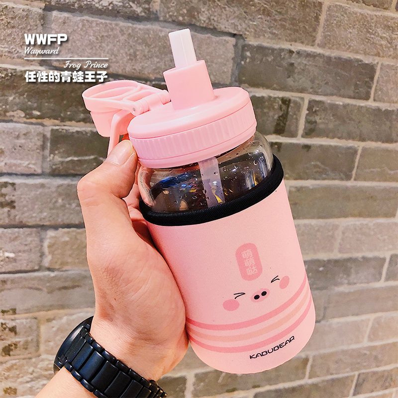 Super cute cute glass straw cup adult creative student kettle leak-proof cup children's suction cup portable with lid