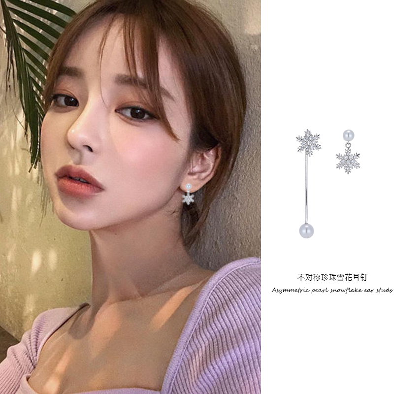 S925 silver asymmetrical snowflake pearl ear nail Korean version minimalist personality temperament 100 hitch and winter style earrings gift woman