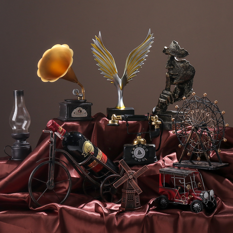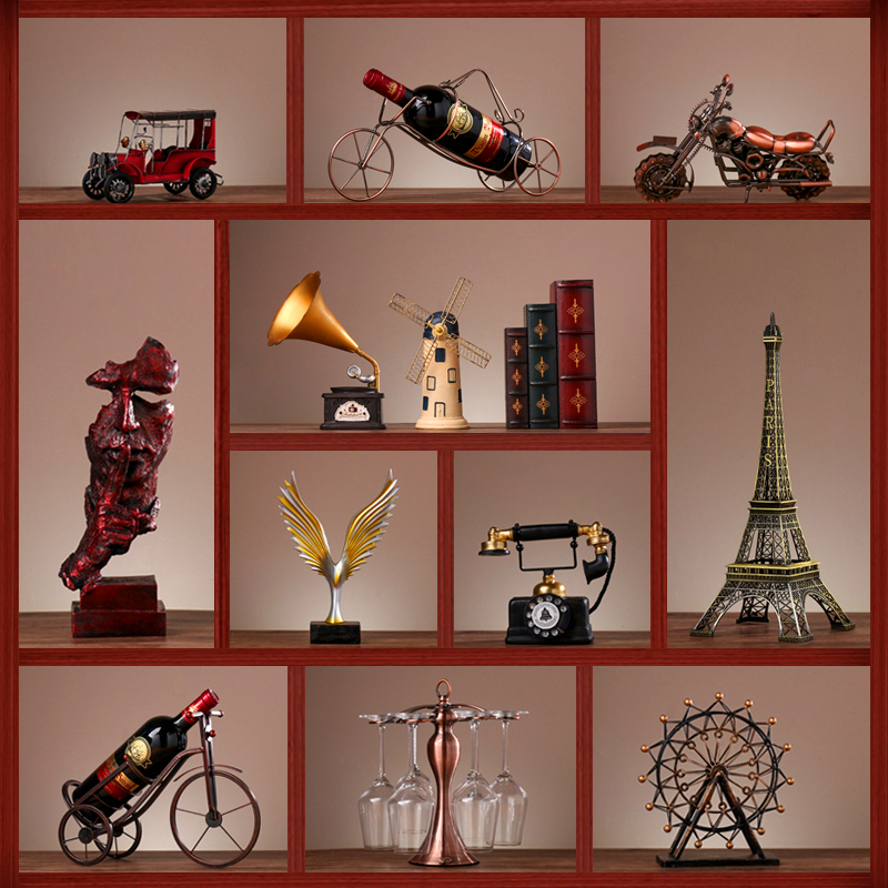 Black tricycle wine rack wrought iron portable tricycle wine rack wrought iron Nordic Dapeng wings resin red car model wrought iron retro old-fashioned telephone resin leaf three-wheeled
