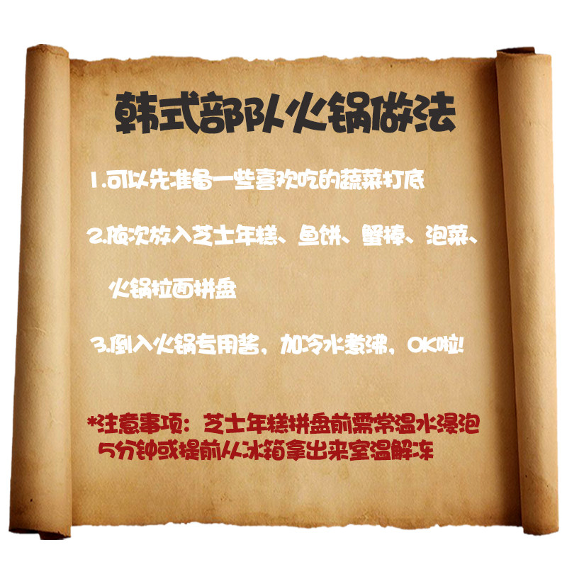 Cheese rice cake 200g Fish cake hot pot sauce 100g Tumbler bread 100g Crab stick 50g Kimchi 40g