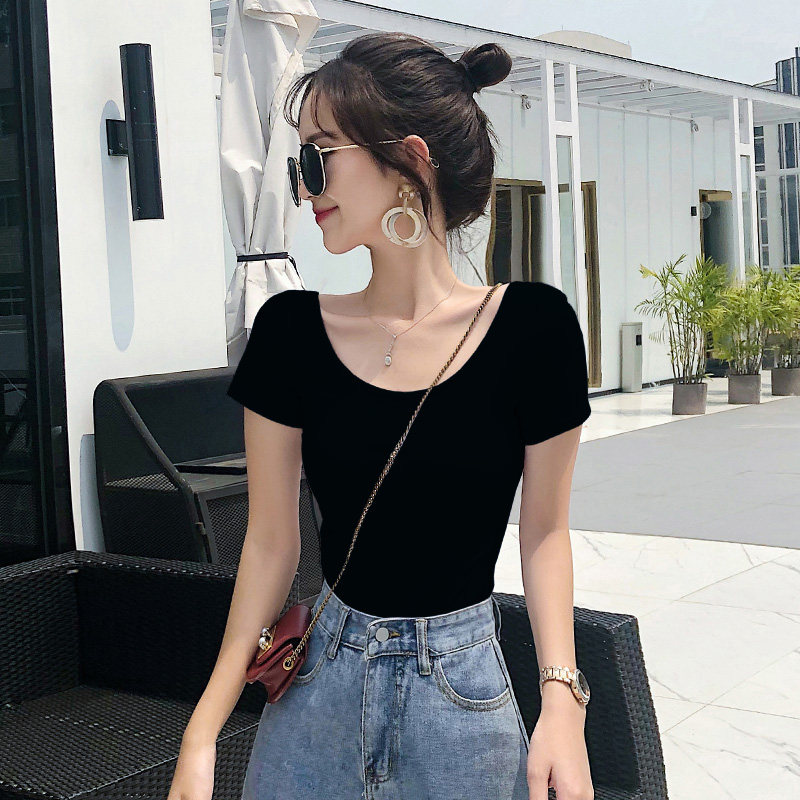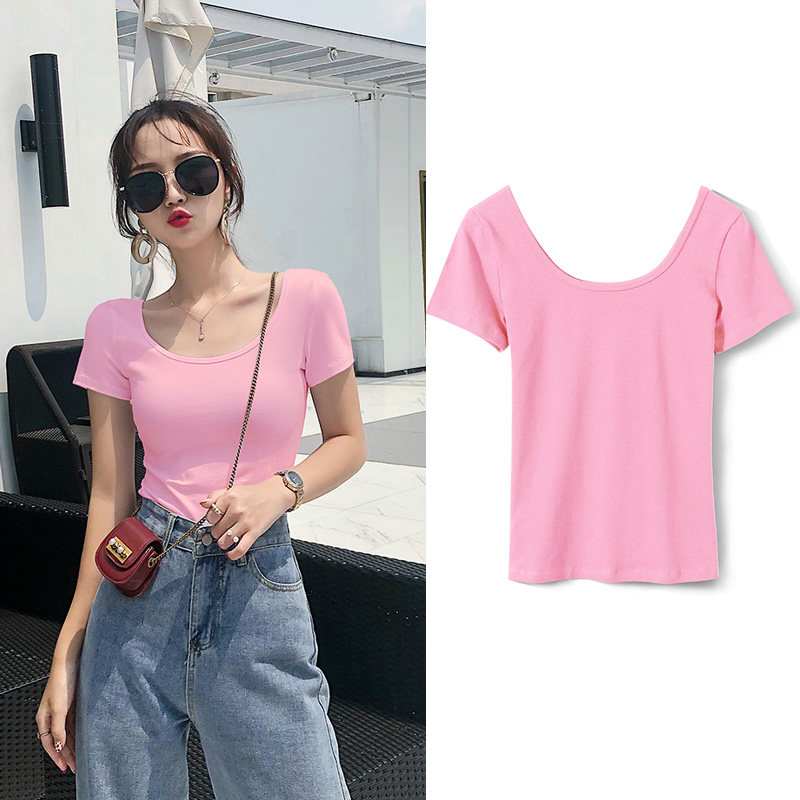 u collar t-shirt female ox oil fruits green short sleeves 2022 Summer new large neckline with pure cotton tight with low collar blouses-Taobao