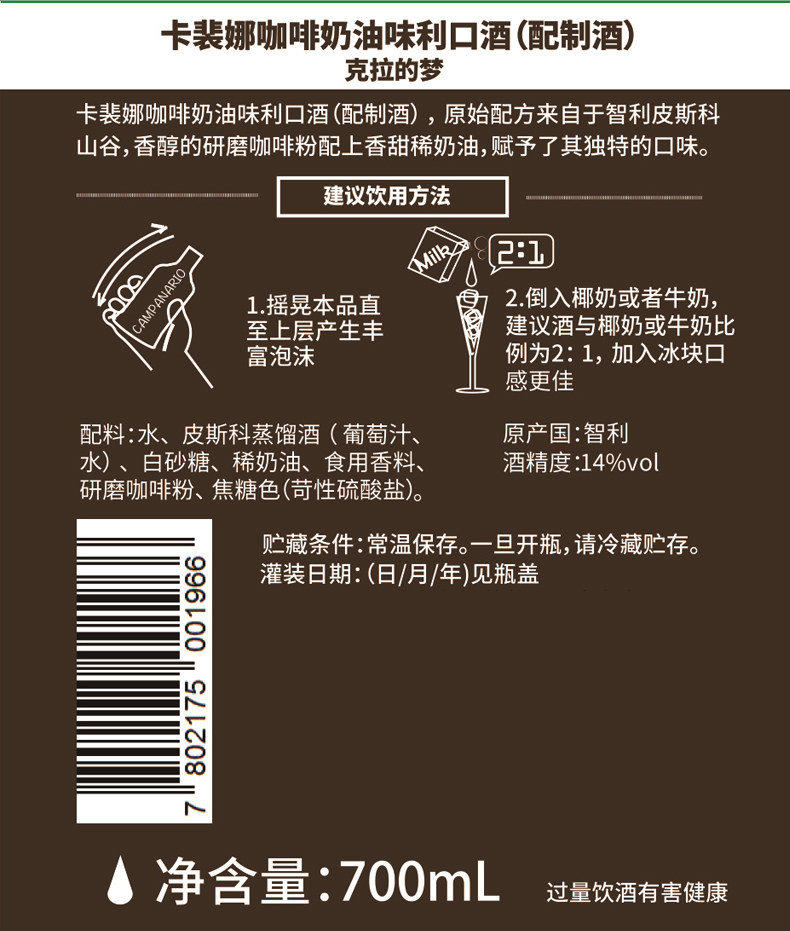 Water Pisco Distilled Wine (Grape Juice) White Sugar Cream Edible Spices Ground Coffee Powder Caramel Color etc.