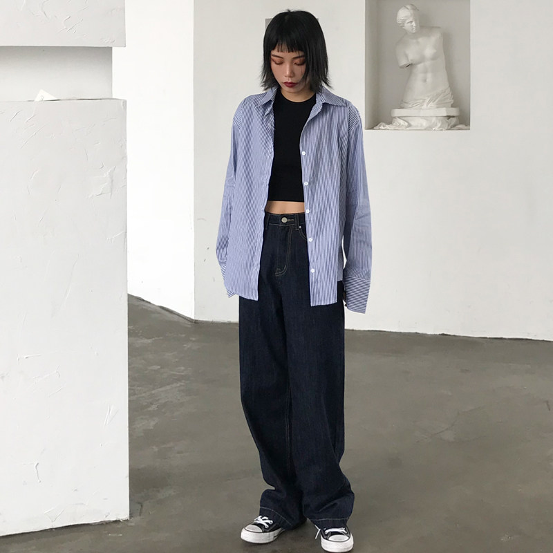 BAYUE August dark blue jeans women's spring and autumn high waist straight tube loose wide leg chic port taste mopping pants